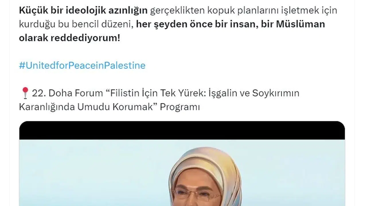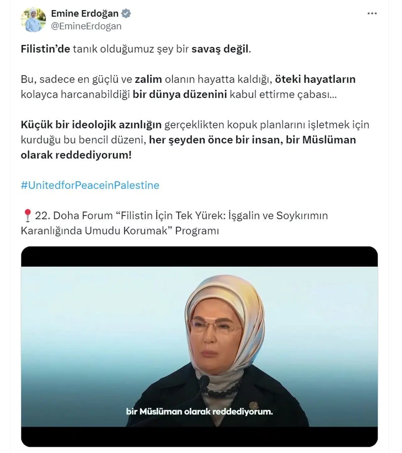 Emine Erdoğan, 22'nci Doha Forumu kapsamında düzenlenen 'Filistin İçin Tek Yürek: İşgalin ve Soykırımın Karanlığında Umudu Korumak' programına ilişkin sosyal medya hesabından paylaşımda bulundu. Erdoğan, paylaşımında, "Filistin'de tanık olduğumuz şey bir savaş değil. Bu, sadece en güçlü ve zalim olanın hayatta kaldığı, öteki hayatların kolayca harcanabildiği bir dünya düzenini kabul ettirme çabası. Küçük bir ideolojik azınlığın gerçeklikten kopuk planlarını işletmek için kurduğu bu bencil düzeni, her şeyden önce bir insan, bir Müslüman olarak reddediyorum" ifadelerini kullandı.