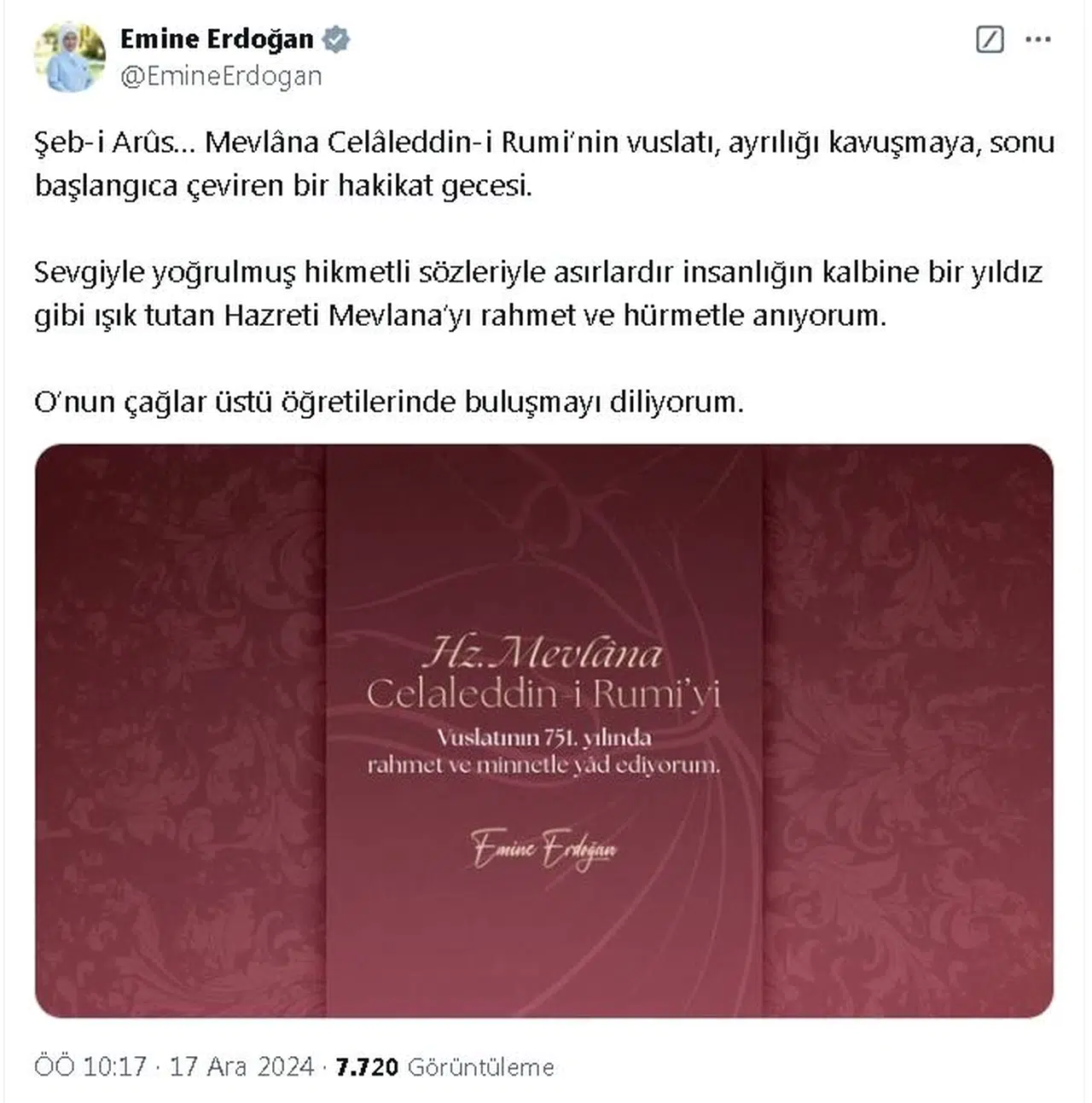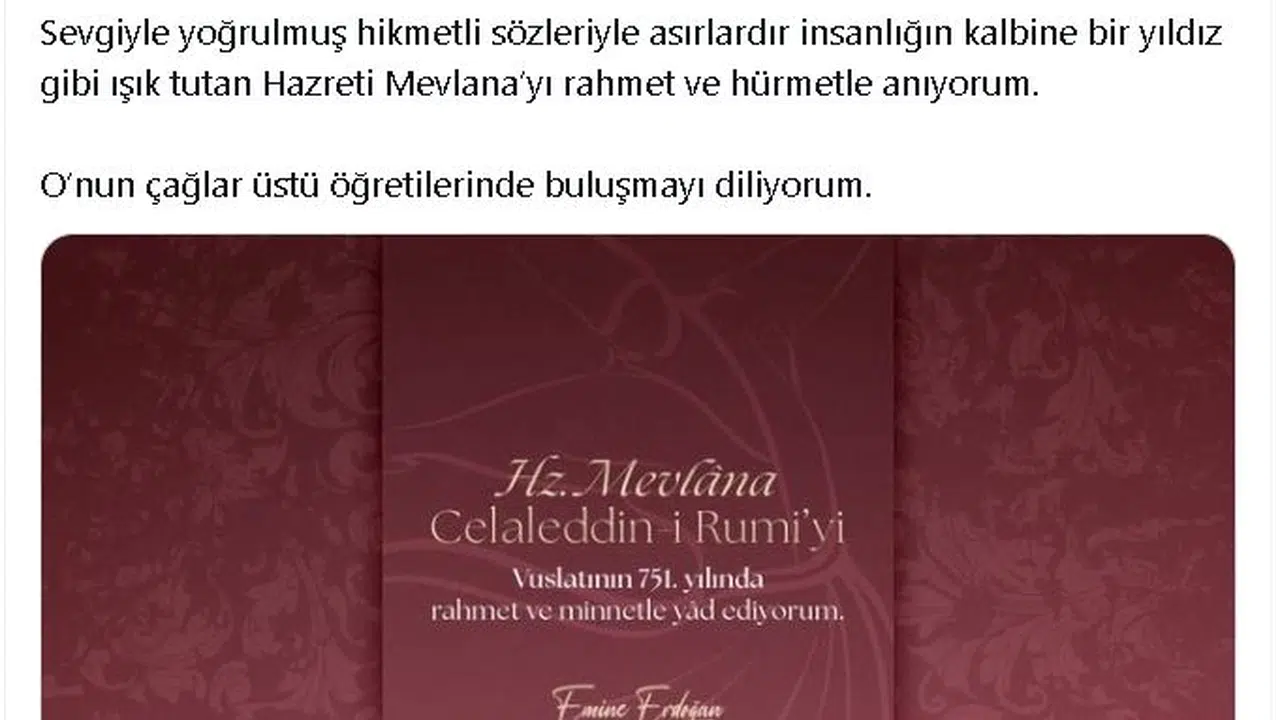 ANKARA, (DHA)- CUMHURBAŞKANI Recep Tayyip Erdoğan'ın eşi Emine Erdoğan, Mevlana Celaleddin-i Rumi'nin ölümünün 751’inci yılında, "Sevgiyle yoğrulmuş hikmetli sözleriyle asırlardır insanlığın kalbine bir yıldız gibi ışık tutan Hazreti Mevlana'yı rahmet ve hürmetle anıyorum" dedi.