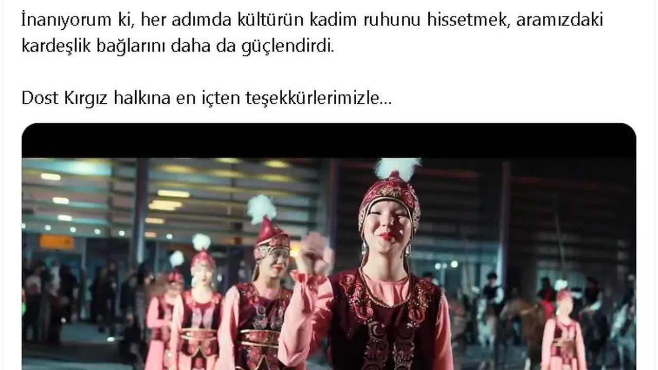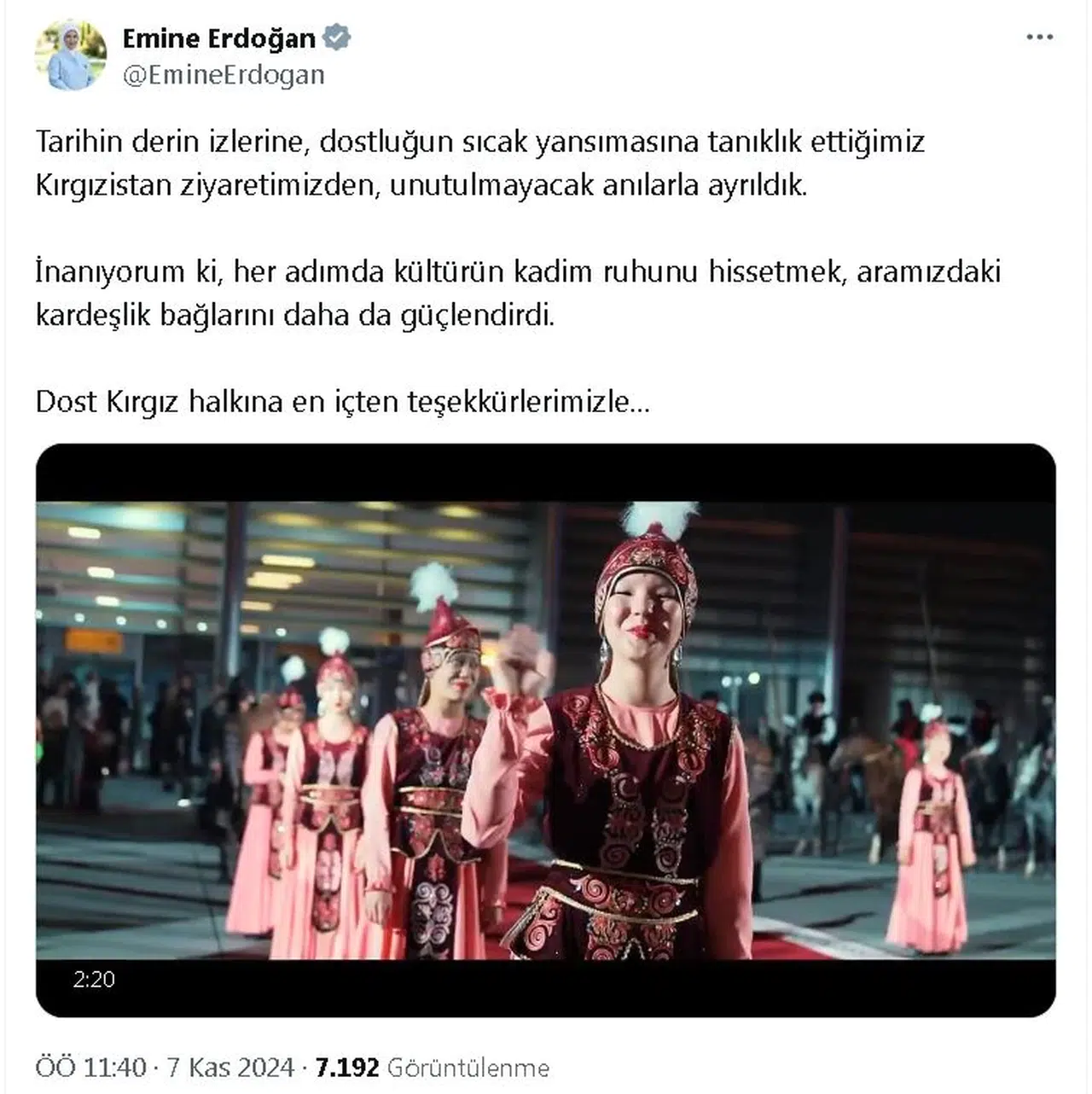 Cumhurbaşkanı Erdoğan'ın, Türk Devletleri Teşkilatı 11'inci Devlet ve Hükümet Başkanları Zirvesi'ne katılmak üzere Kırgızistan'ın başkenti Bişkek'e gerçekleştirdiği resmi ziyarete eşlik eden Emine Erdoğan, sosyal medya hesabından ziyarete ilişkin paylaşım yaptı. Emine Erdoğan paylaşımda, "Tarihin derin izlerine, dostluğun sıcak yansımasına tanıklık ettiğimiz Kırgızistan ziyaretimizden, unutulmayacak anılarla ayrıldık. İnanıyorum ki her adımda kültürün kadim ruhunu hissetmek, aramızdaki kardeşlik bağlarını daha da güçlendirdi. Dost Kırgız halkına en içten teşekkürlerimizle" dedi.