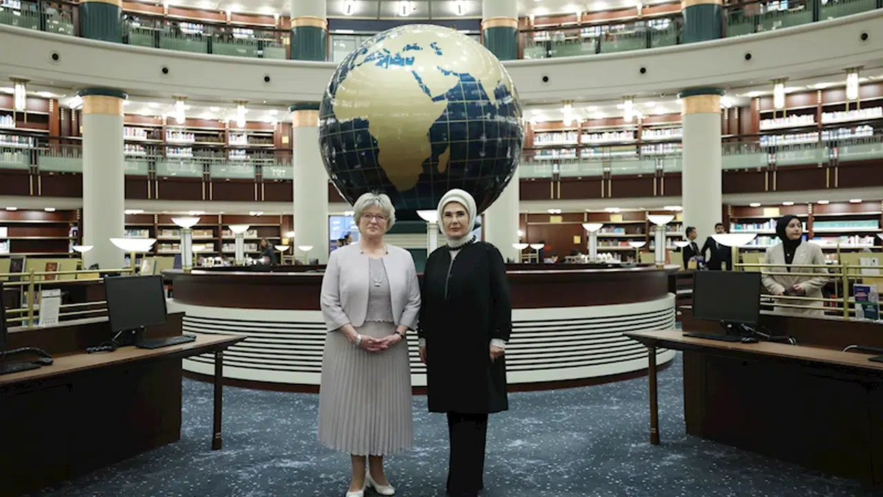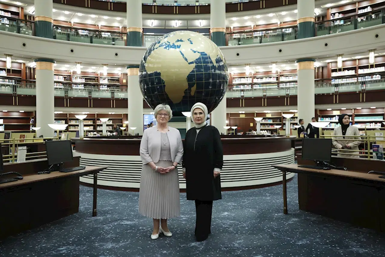 Cumhurbaşkanı Erdoğan'ın eşi Emine Erdoğan, Macaristan Cumhurbaşkanı Tamas Sulyok'un eşi Zsuzsanna Nagy ile Cumhurbaşkanlığı Millet Kütüphanesi'ni ziyaret etti. Birlikte Millet Kütüphanesi'ne giren Emine Erdoğan ve Nagy'ye kütüphanede bulunan vatandaşlar ve öğrenciler yoğun ilgi gösterdi.
