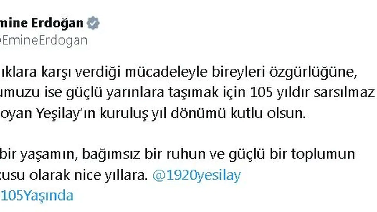 Emine Erdoğan, sosyal medya hesabından yaptığı açıklamada, "Bağımlılıklara karşı verdiği mücadeleyle bireyleri özgürlüğüne, toplumumuzu ise güçlü yarınlara taşımak için 105 yıldır sarsılmaz bir irade ortaya koyan Yeşilay'ın kuruluş yıl dönümü kutlu olsun. Sağlıklı bir yaşamın, bağımsız bir ruhun ve güçlü bir toplumun savunucusu olarak nice yıllara" ifadelerini kullandı. (DHA)