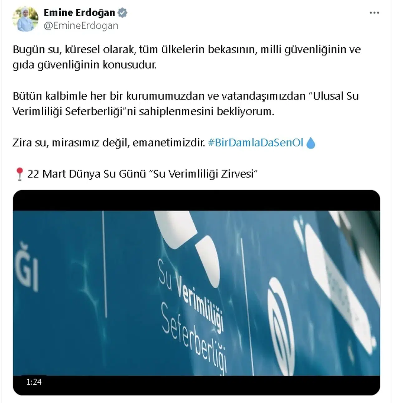 Emine Erdoğan'dan '22 Mart Dünya Su Günü: Su Verimliliği Zirvesi'ne ilişkin paylaşım