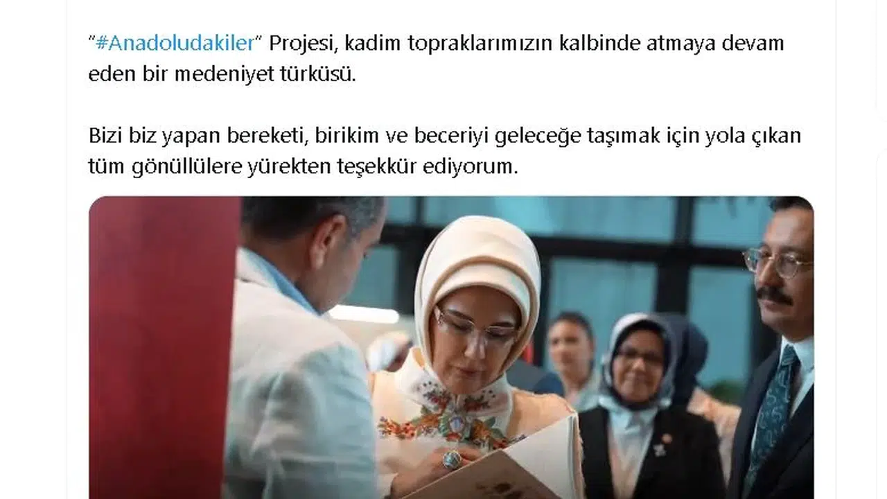 ANKARA, (DHA)- CUMHURBAŞKANI Recep Tayyip Erdoğan'ın eşi Emine Erdoğan, dün tanıtılan 'Anadoludakiler' projesiyle bereketi, birikim ve beceriyi geleceğe taşımak için yola çıkan gönüllülere teşekkür etti.