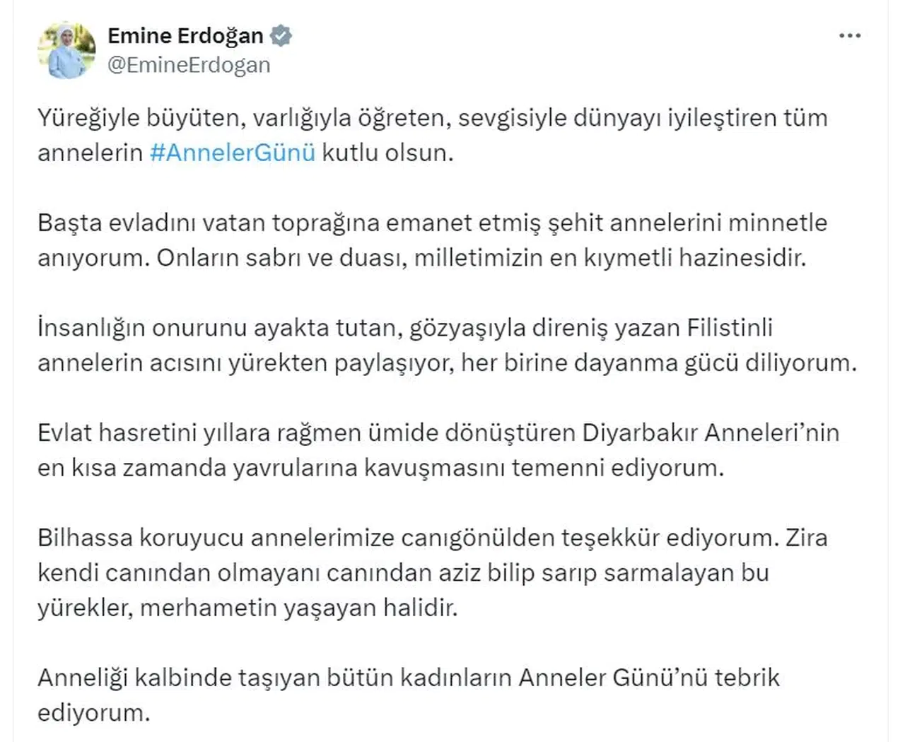 Emine Erdoğan, sosyal medya hesabından yaptığı paylaşımda, "Yüreğiyle büyüten, varlığıyla öğreten, sevgisiyle dünyayı iyileştiren tüm annelerin Anneler Günü kutlu olsun. Başta evladını vatan toprağına emanet etmiş şehit annelerini minnetle anıyorum. Onların sabrı ve duası, milletimizin en kıymetli hazinesidir. İnsanlığın onurunu ayakta tutan, gözyaşıyla direniş yazan Filistinli annelerin acısını yürekten paylaşıyor, her birine dayanma gücü diliyorum" dedi.