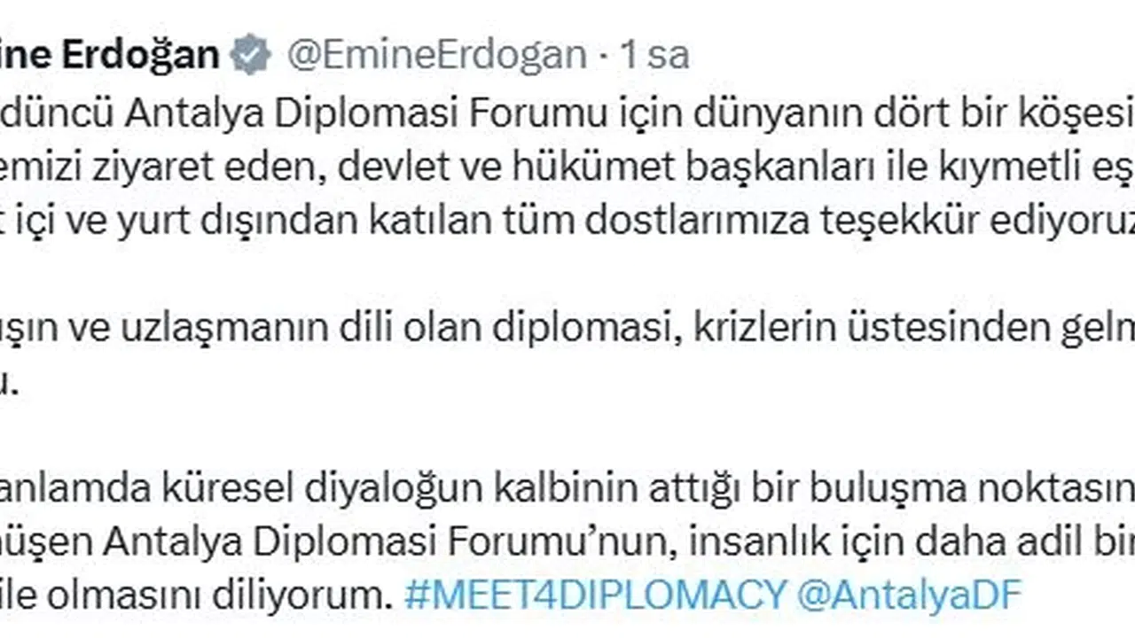 Emine Erdoğan'dan Antalya Diplomasi Forumu'na ilişkin paylaşım
