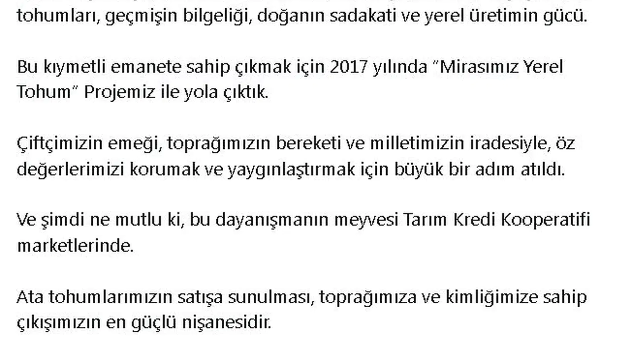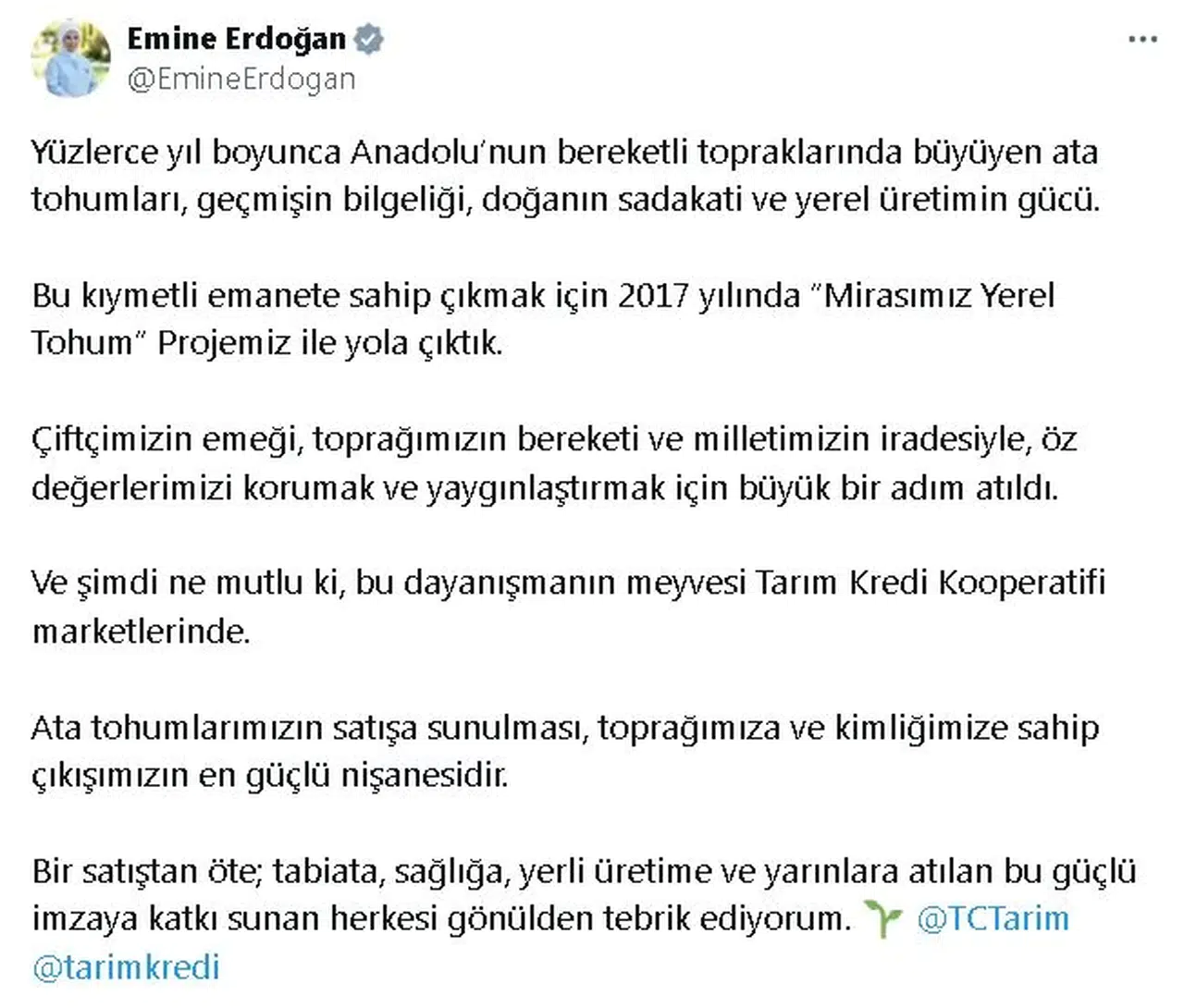 Cumhurbaşkanı Recep Tayyip Erdoğan'ın eşi Emine Erdoğan, sosyal medya hesabından yaptığı açıklamada, "Yüzlerce yıl boyunca Anadolu'nun bereketli topraklarında büyüyen ata tohumları, geçmişin bilgeliği, doğanın sadakati ve yerel üretimin gücü. Bu kıymetli emanete sahip çıkmak için 2017 yılında 'Mirasımız Yerel Tohum' projemiz ile yola çıktık. Çiftçimizin emeği, toprağımızın bereketi ve milletimizin iradesiyle, öz değerlerimizi korumak ve yaygınlaştırmak için büyük bir adım atıldı. Ve şimdi ne mutlu ki bu dayanışmanın meyvesi Tarım Kredi Kooperatifi marketlerinde. Ata tohumlarımızın satışa sunulması, toprağımıza ve kimliğimize sahip çıkışımızın en güçlü nişanesidir. Bir satıştan öte; tabiata, sağlığa, yerli üretime ve yarınlara atılan bu güçlü imzaya katkı sunan herkesi gönülden tebrik ediyorum" ifadelerini kullandı. (DHA)