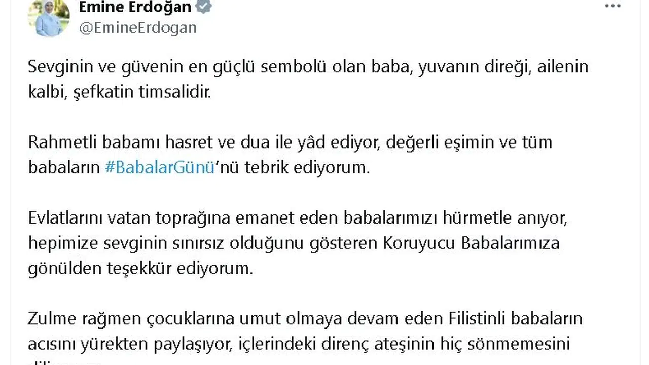 Emine Erdoğan, Babalar Günü nedeniyle sosyal medya hesabından paylaştığı mesajda, "Sevginin ve güvenin en güçlü sembolü olan baba, yuvanın direği, ailenin kalbi, şefkatin timsalidir. Rahmetli babamı hasret ve dua ile yad ediyor, değerli eşimin ve tüm babaların Babalar Günü'nü tebrik ediyorum. Evlatlarını vatan toprağına emanet eden babalarımızı hürmetle anıyor, hepimize sevginin sınırsız olduğunu gösteren koruyucu babalarımıza gönülden teşekkür ediyorum. Zulme rağmen çocuklarına umut olmaya devam eden Filistinli babaların acısını yürekten paylaşıyor, içlerindeki direnç ateşinin hiç sönmemesini diliyorum" dedi. (DHA)