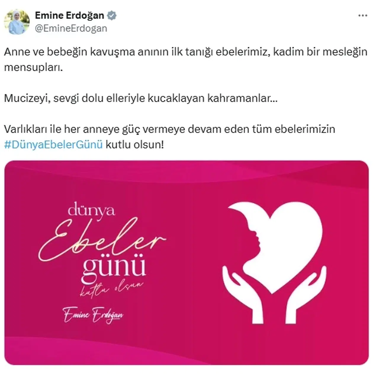 ANKARA, (DHA)- CUMHURBAŞKANI Recep Tayyip Erdoğan'ın eşi Emine Erdoğan, sosyal medya hesabından yaptığı paylaşımla Dünya Ebeler Günü'nü kutladı.