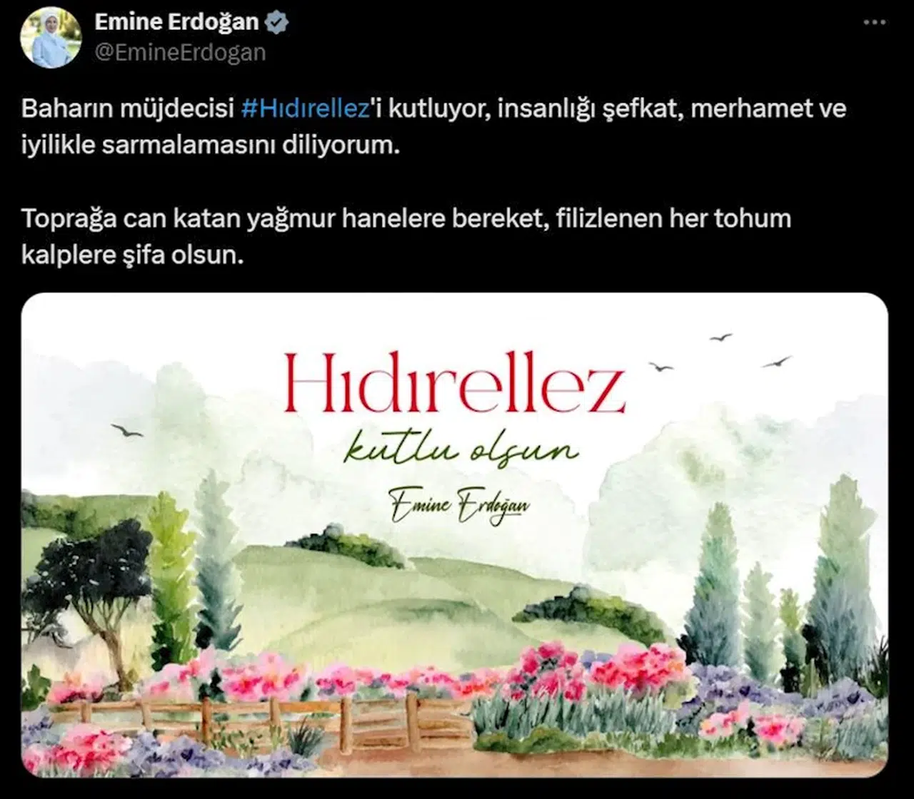 ANKARA, (DHA)- CUMHURBAŞKANI Recep Tayyip Erdoğan'ın eşi Emine Erdoğan, Hıdırellez paylaşımında bulundu.