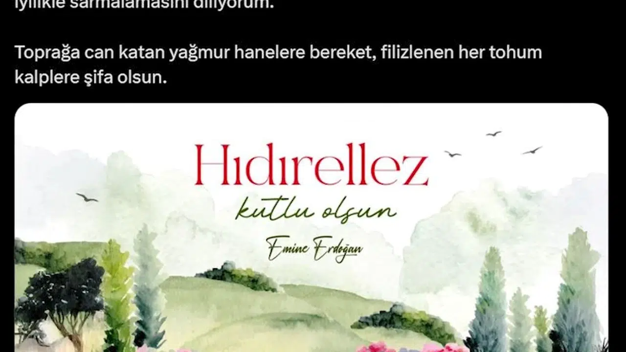 Emine Erdoğan, sosyal medya hesabından yaptığı paylaşımda, "Baharın müjdecisi Hıdırellez'i kutluyor, insanlığı şefkat, merhamet ve iyilikle sarmalamasını diliyorum. Toprağa can katan yağmur hanelere bereket, filizlenen her tohum kalplere şifa olsun" ifadelerine yer verdi. (DHA)