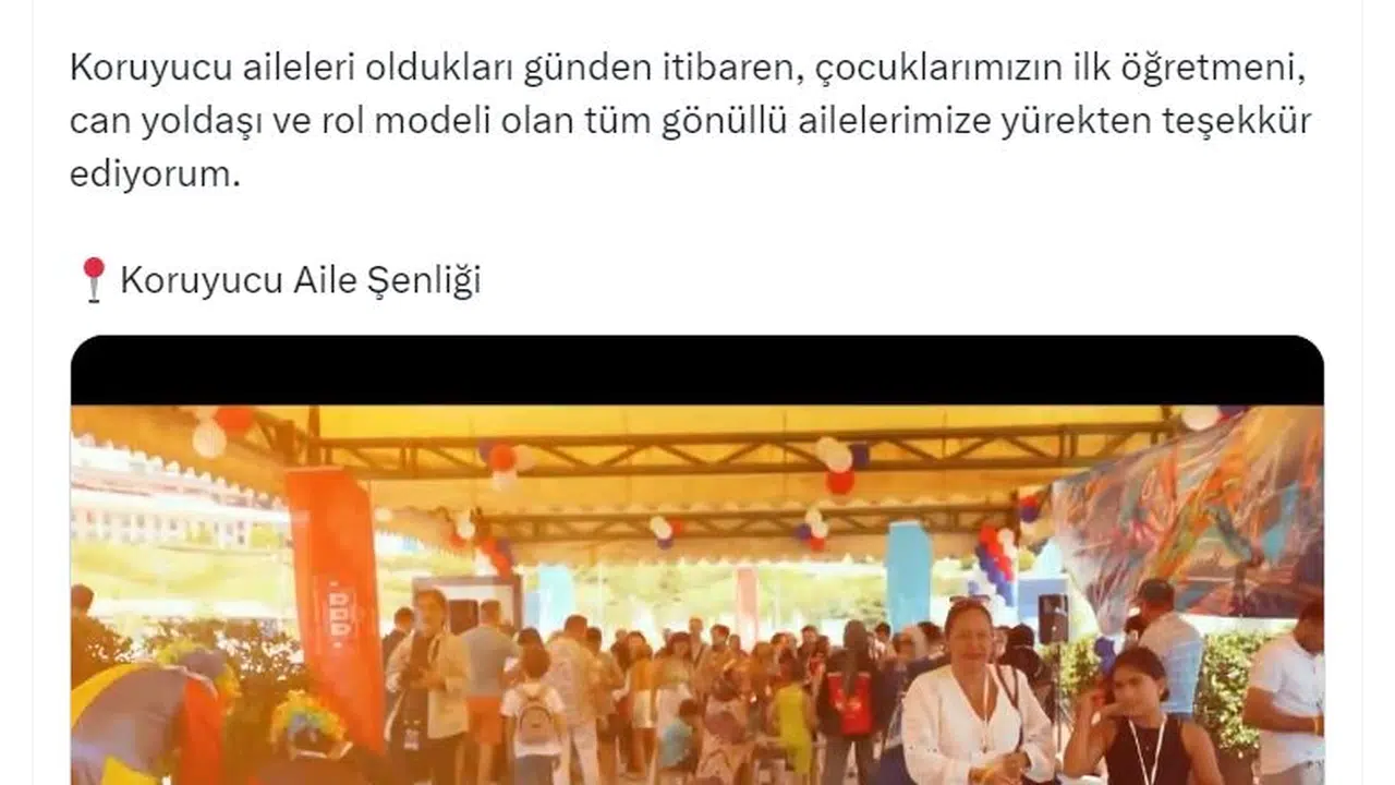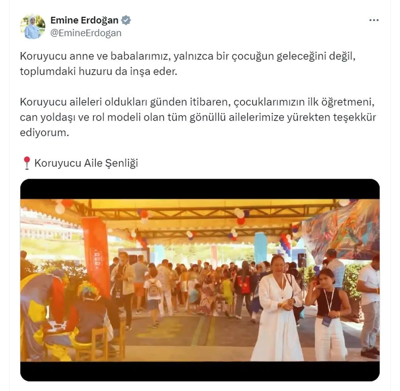 Emine Erdoğan, sosyal medya hesabından yaptığı paylaşımda, "Koruyucu anne ve babalarımız, yalnızca bir çocuğun geleceğini değil, toplumdaki huzuru da inşa eder. Koruyucu aileleri oldukları günden itibaren, çocuklarımızın ilk öğretmeni, can yoldaşı ve rol modeli olan tüm gönüllü ailelerimize yürekten teşekkür ediyorum" dedi. Erdoğan, paylaşımında şenlikte yaptığı konuşmadan ve programın detaylarından hazırlanan videoya yer verdi. (DHA)