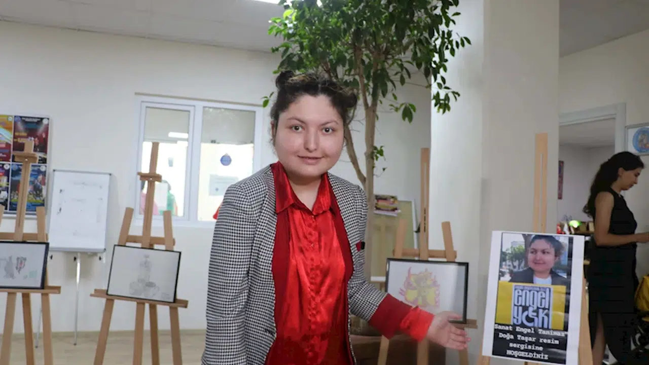 İzmir'de yaşayan serebral palsi hastası yüzde 94 engelli, Doğa Taşar'ın (23), sadece sol elini kullanarak yaptığı resimler 'Sanat Engel Tanımaz' projesi ile açılan sergide ilgi odağı olmaya devam ediyor. Çizgi filmlerden esinlenerek yaptığı resimleri ile 9'uncu sergisini açan Doğa, motive olarak, örnek olmayı başarıyor. 18 yıldır Doğa'nın resim çizdiğini belirten Doğa Taşar'ın annesi Aslı Taşar, "Kaynaştırma öğrencisi olarak başladığı ilkokulda, diğer çocuklar ile öğrenme açısından geri kalmaya başladı. Bir süre sonra Doğa'nın sıranın arkasında resim çizmeye başladığını fark ettim. Bu yeteneğini sosyalleşebilmesi için geliştirmek istedik. Daha sonra Doğa'nın yaptığı resimleri sosyal medya hesabından paylaştım. Derneklerden gelen destekler ile bugüne kadar geldik" ifadelerini kullandı.