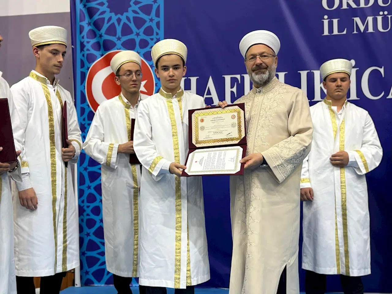 Altınordu ilçesi Recep Kara Spor Salonu’nda İl Müftülüğü tarafından düzenlenen hafızlık icazet törenine katılan ve 452 hafıza icazet belgesi takdim eden Diyanet İşleri Başkanı Ali Erbaş, hafızların ömrü boyunca insanları iyiliğe davet edeceklerini belirterek, “Bugün, 452 hafızımızın icazet merasimi vesilesi ile bir aradayız. Peygamber Efendimiz (S.A.V.) buyuruyor ki, ‘Sizin en hayırlınız, Kur’an’ı öğrenen ve öğretenlerinizdir’ demiştir. Cenabıhak, Kur’an-ı Kerim’i Peygamber Efendimize en büyük mucize olarak göndermiştir. Kur’an’ın dışında dünyada başka hiçbir kitaba başından sonuna bu şekilde ezberlenmek nasip olmamıştır. Dünyada ne Tevrat ne de İncil hafızı var. Ama milyonlarca Kur’an hafızı var. Sadece ülkemizde icazetnamesini almış ve hak etmiş 255 bin hafızımız var. Bir o kadar da icazetnamesiz olan hafızımız var. Nereden baksanız yarım milyon Kur’an hafızına sahip bir ülkeyiz çok şükür” dedi.