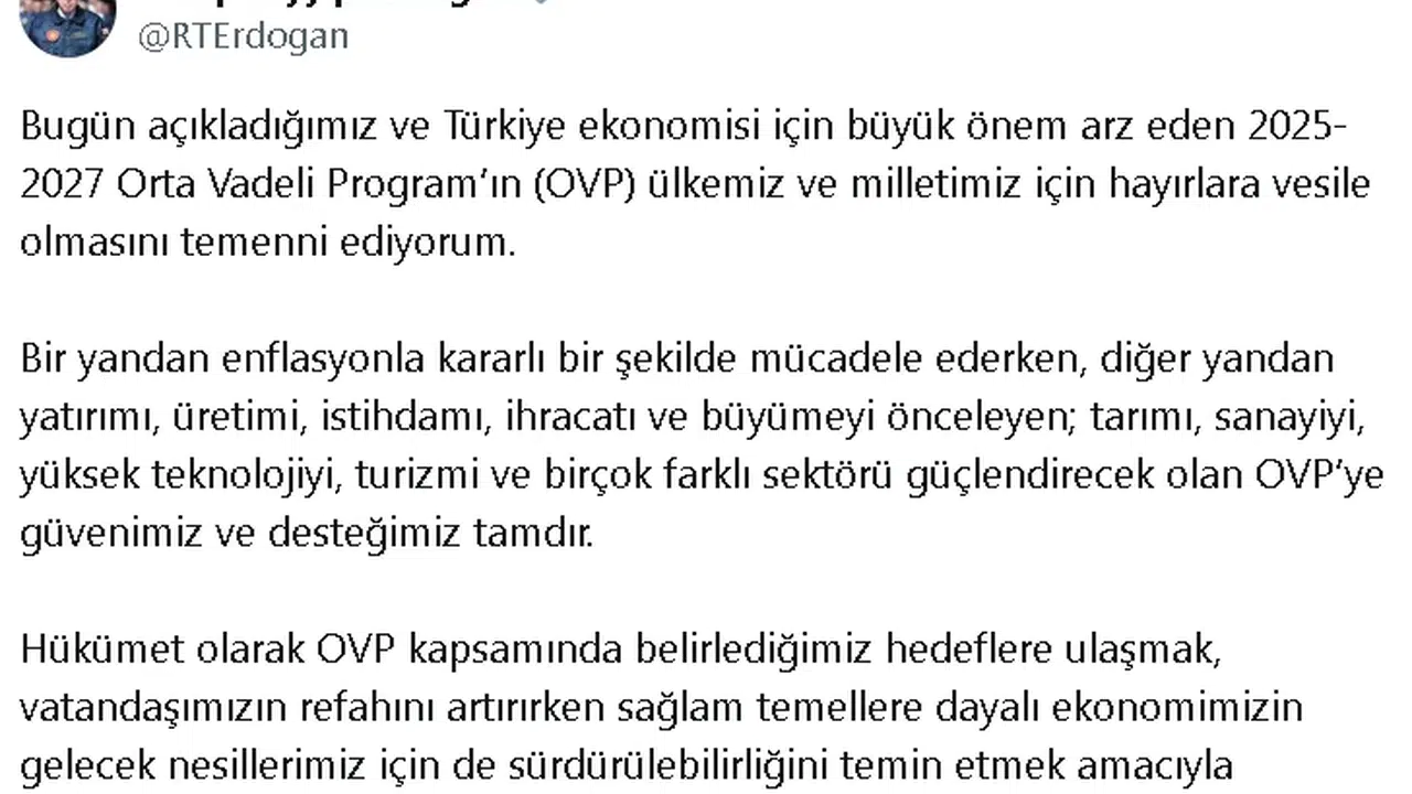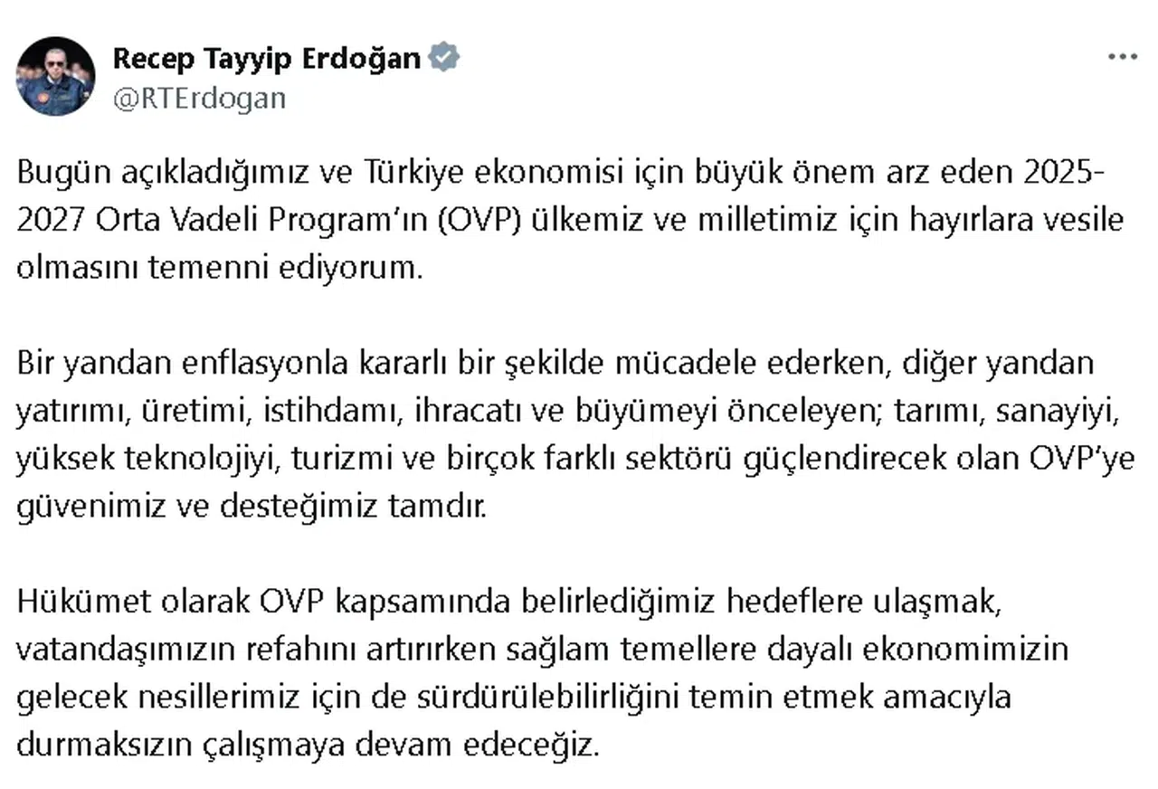 Cumhurbaşkanı Erdoğan, sosyal medya hesabından yaptığı açıklamada, "Bugün açıkladığımız ve Türkiye ekonomisi için büyük önem arz eden 2025-2027 Orta Vadeli Program’ın (OVP) ülkemiz ve milletimiz için hayırlara vesile olmasını temenni ediyorum. Bir yandan enflasyonla kararlı bir şekilde mücadele ederken, diğer yandan yatırımı, üretimi, istihdamı, ihracatı ve büyümeyi önceleyen; tarımı, sanayiyi, yüksek teknolojiyi, turizmi ve birçok farklı sektörü güçlendirecek olan OVP’ye güvenimiz ve desteğimiz tamdır. Hükümet olarak OVP kapsamında belirlediğimiz hedeflere ulaşmak, vatandaşımızın refahını artırırken sağlam temellere dayalı ekonomimizin gelecek nesillerimiz için de sürdürülebilirliğini temin etmek amacıyla durmaksızın çalışmaya devam edeceğiz" ifadelerine yer verdi. (DHA)