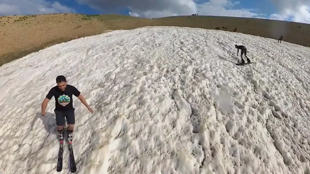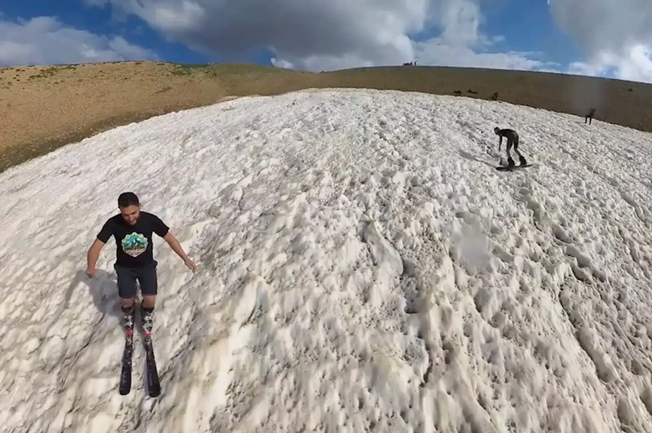 Muzaffer KOŞAN / ERZİNCAN, (DHA)- Hava sıcaklığının gölgede 36 dereceyi bulduğu Erzincan’da, 4 arkadaş Munzur Dağları'nın 3 bin 300 rakımlı zirvesine çıkıp kayak ve snowboard yaptı.