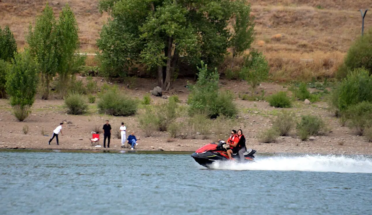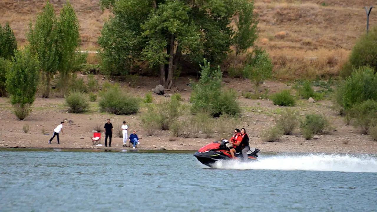Salih TEKİN/ERZURUM, (DHA)- ERZURUM'un Palandöken ilçesinde 2 bin 300 metre rakımda sulama amaçlı yaptırılan Tekederesi Göleti, piknikçilere jet ski keyfi sunuyor. Belediyeye ait sosyal tesislere hafta sonları pikniğe gelenler, jet skiyle gölette tur atıyor.