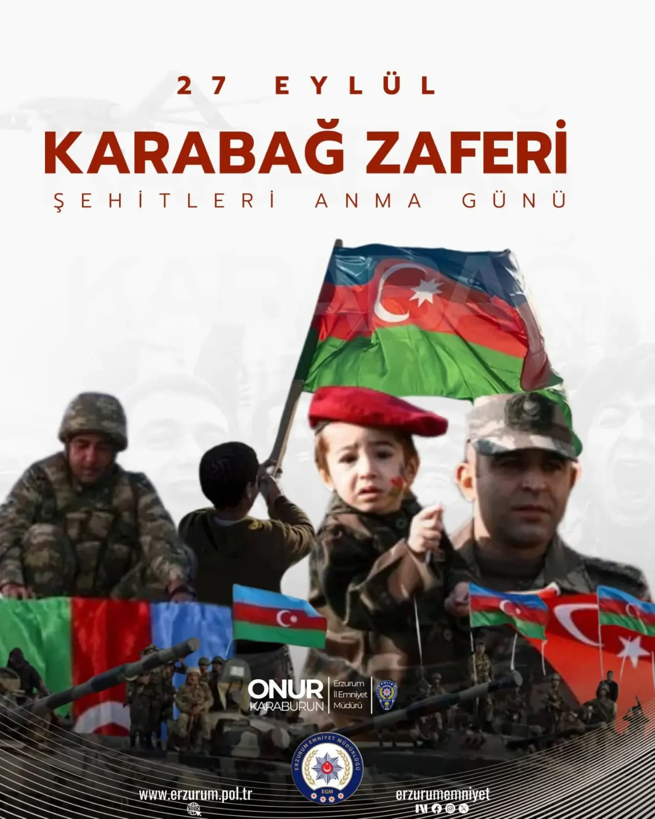 Erzurum 27 Eylül Karabağ Şehitleri Anma Günü, Erzurum’da düzenlenen etkinliklerle anlamlı bir şekilde kutlandı. Vatan uğruna canlarını feda eden kahramanlar, düzenlenen törenler ve sosyal medya paylaşımlarıyla rahmet, minnet ve saygıyla anıldı. Erzurum Emniyet Müdürlüğü, sosyal medya hesabından yaptığı paylaşımda şehitlerimizin aziz hatırasının her zaman yaşatılacağını belirterek, vatandaşları bu anlamlı günü anmaya davet etti.