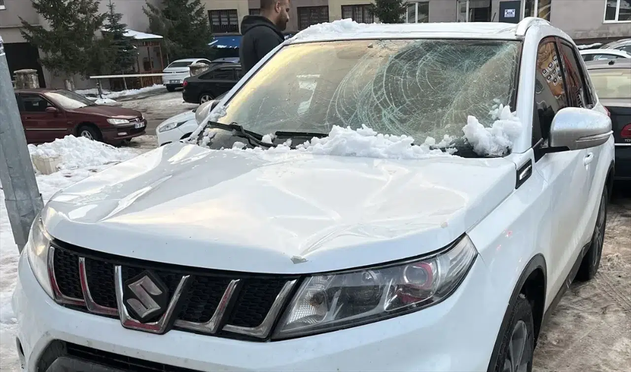 Erzurum'un Merkez Yakutiye ilçesinde bir apartmanın çatısından düşen kar kütleleri, park halindeki bir araca hasar verdi. Araçta kimsenin olmadığı belirtildi.