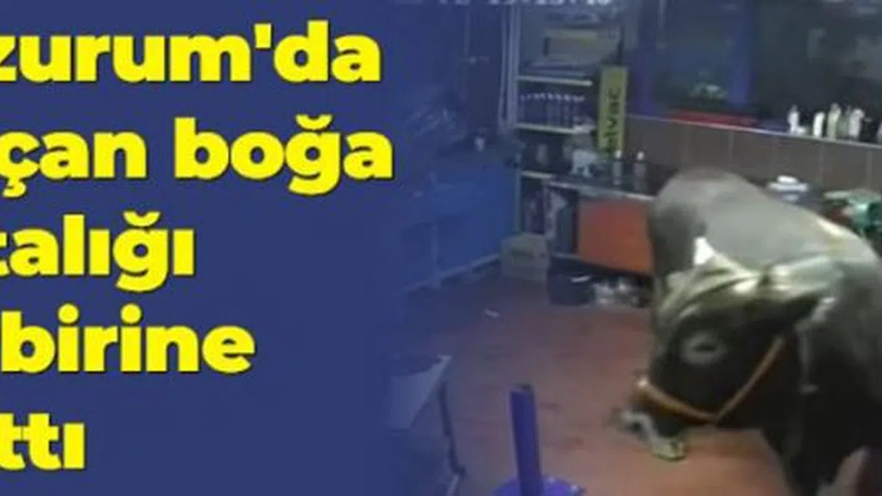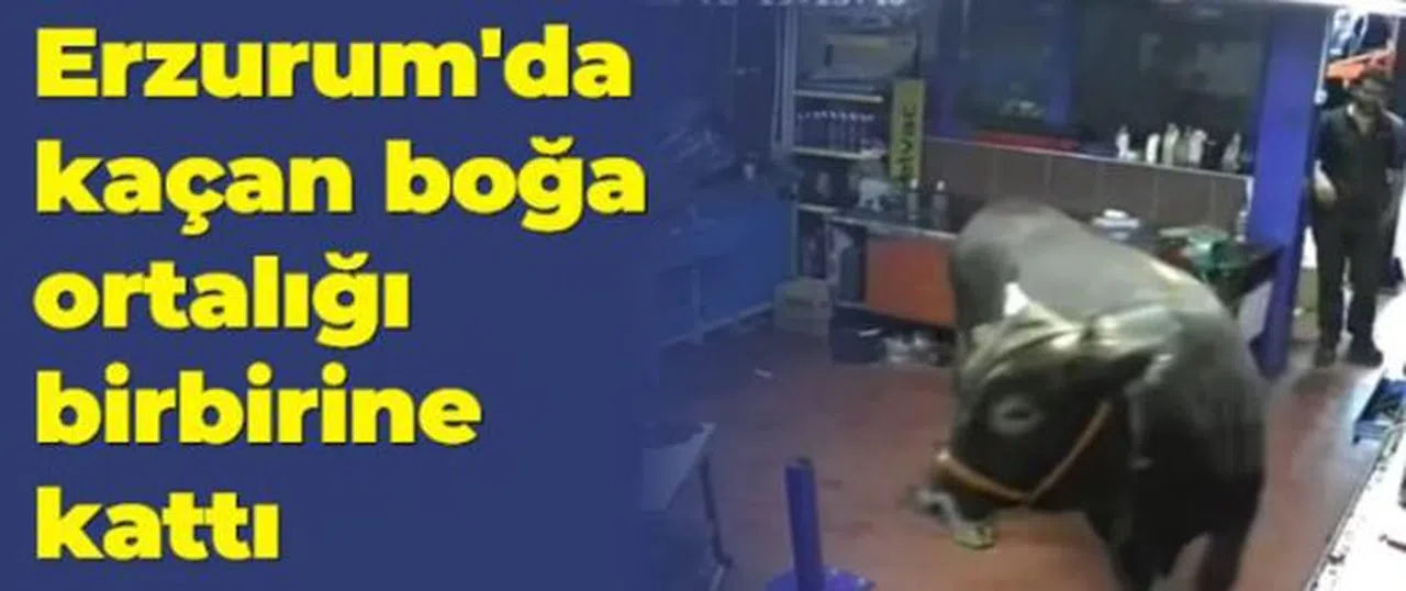 Erzurum'da kurbanlık olarak satılmak üzere pazara götürülen tosun Yakutiye ilçesinin Sanayi Mahallesi'nde sahiplerinin elinden kaçtı. Boğayı yakalamak isteyen bir kişi boynuzlarından tutunca metrelerce yerde sürüklendi. Canı yanan kişi boğayı bırakmak zorunda kaldı. Bu sırada iyice huysuzlanan boğa, oradaki bir otomobil tamirhanesine girdi. Boğanın geldiğini gören tamirhanedeki müşteri ve çalışanlar sağa sola kaçarak saklanacak yer aradı. İşyerinin güvenlik kameralarına saniye saniye yansıyan görüntülerde boğa işyerindekilerinde yardımı ile kısa sürede yakalandı.