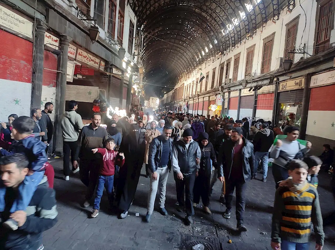 Trafik yoğunluğunun olduğu kentin simgelerinden olan tarihi Şam Kapalı Çarşısı'nda ise birçok esnaf iş yerlerinin Suriye bayrağını simgeleyen renklerin boyalı olduğu kepenklerini beyaza boyayarak geçmişin izlerini silmeye başladı.
