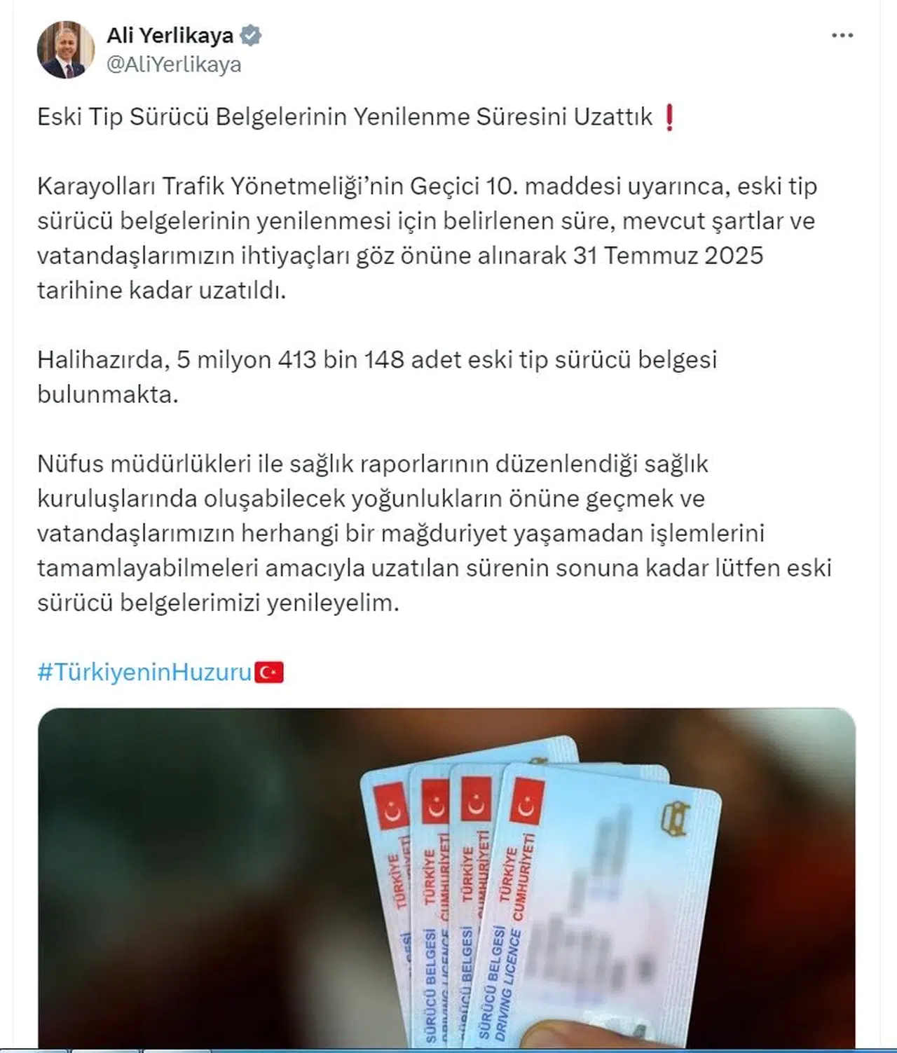 ANKARA, (DHA)- İÇİŞLERİ Bakanı Ali Yerlikaya, eski tip sürücü belgelerinin yenilenme süresinin 31 Temmuz 2025 tarihine kadar uzatıldığını duyurdu.