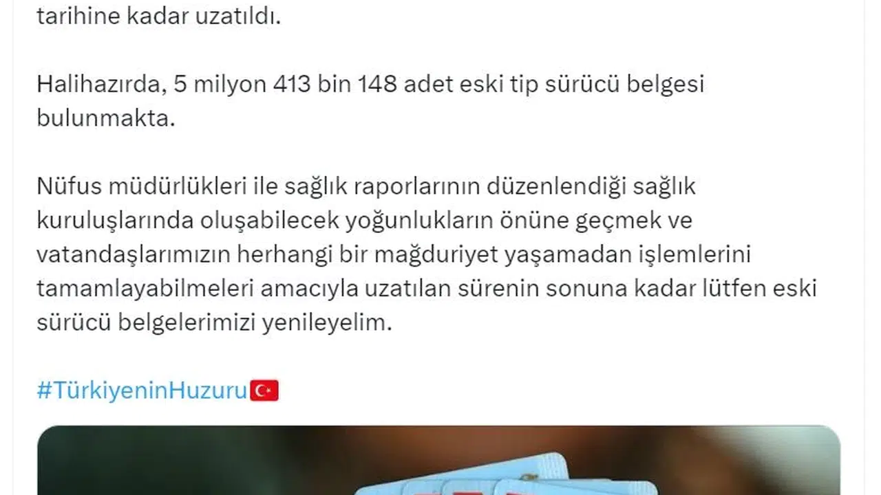 Bakan Yerlikaya, sosyal medya hesabından yaptığı açıklamada, "Karayolları Trafik Yönetmeliği'nin Geçici 10'uncu maddesi uyarınca, eski tip sürücü belgelerinin yenilenmesi için belirlenen süre, mevcut şartlar ve vatandaşlarımızın ihtiyaçları göz önüne alınarak 31 Temmuz 2025 tarihine kadar uzatıldı. Halihazırda, 5 milyon 413 bin 148 adet eski tip sürücü belgesi bulunmakta. Nüfus müdürlükleri ile sağlık raporlarının düzenlendiği sağlık kuruluşlarında oluşabilecek yoğunlukların önüne geçmek ve vatandaşlarımızın herhangi bir mağduriyet yaşamadan işlemlerini tamamlayabilmeleri amacıyla uzatılan sürenin sonuna kadar lütfen eski sürücü belgelerimizi yenileyelim" ifadelerini kullandı. (DHA)