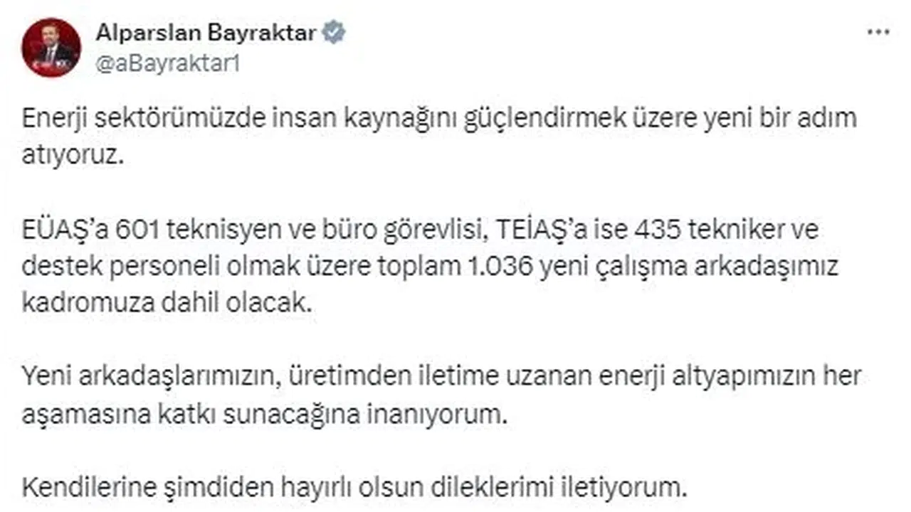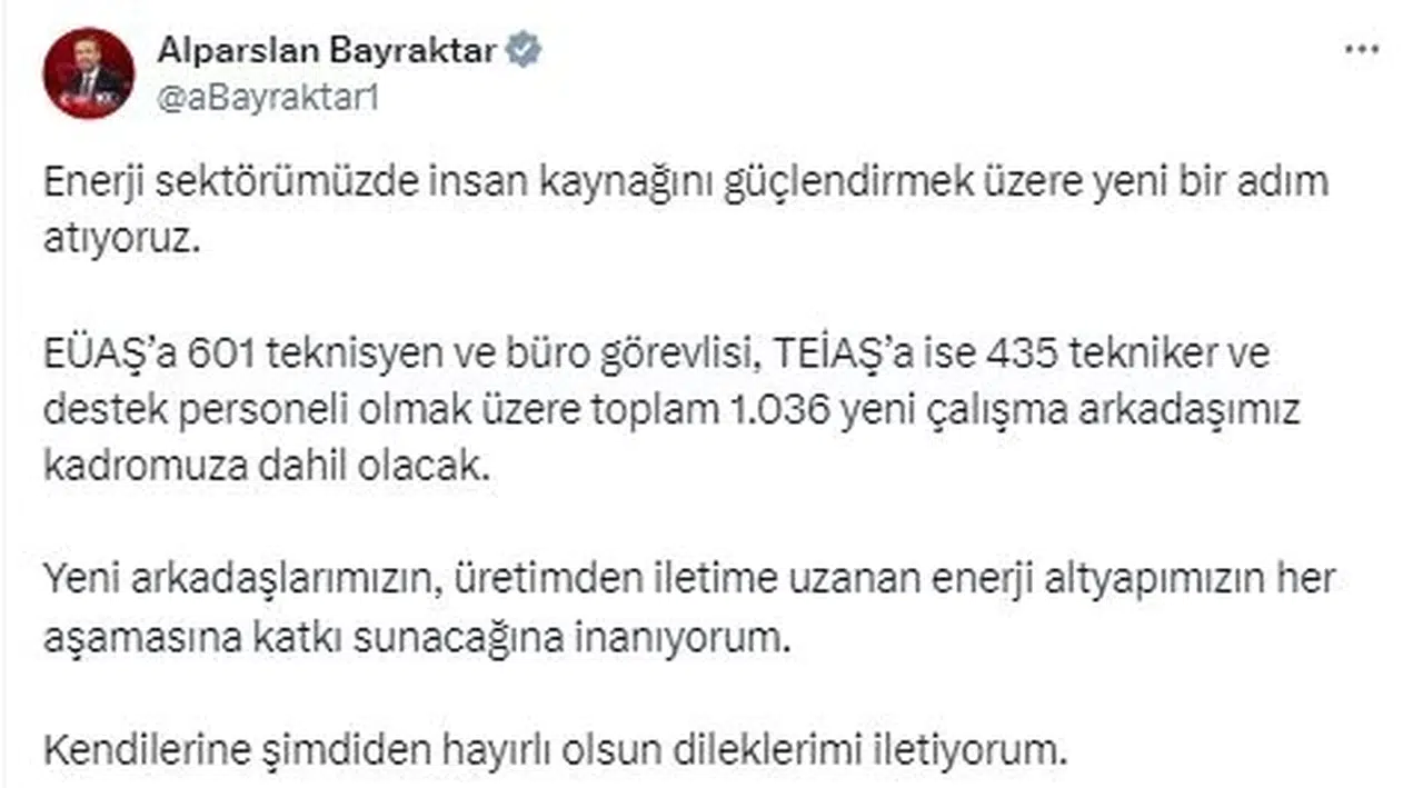 Enerji ve Tabii Kaynaklar Bakanı Alparslan Bayraktar, sosyal medya hesabından yaptığı açıklamada, "Enerji sektörümüzde insan kaynağını güçlendirmek üzere yeni bir adım atıyoruz. EÜAŞ'a 601 teknisyen ve büro görevlisi, TEİAŞ'a ise 435 tekniker ve destek personeli olmak üzere toplam 1036 yeni çalışma arkadaşımız kadromuza dahil olacak. Yeni arkadaşlarımızın, üretimden iletime uzanan enerji altyapımızın her aşamasına katkı sunacağına inanıyorum. Kendilerine şimdiden hayırlı olsun dileklerimi iletiyorum" dedi.