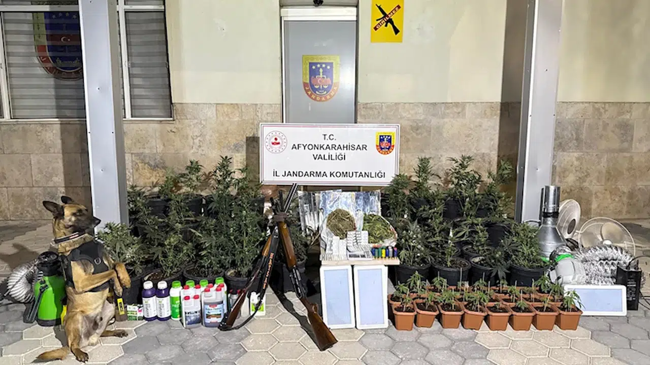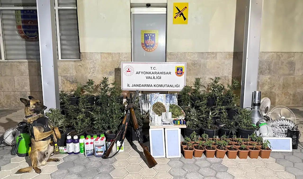 Afyonkarahisar İl Jandarma Komutanlığı ekipleri, Emirdağ ilçesinde uyuşturucu madde ticareti yapan ve ruhsatsız silah bulundurduğu tespit edilen G.E.Ö. ve A.A.'nın evine operasyon düzenledi. Arama yapan ekipler, 63 kök kenevir bitkisi, 1407 gram esrar, 32 gram kenevir tohumu, 297 adet sentetik ecza maddesi, 3 adet ruhsatsız av tüfeği, 3 adet iklimlendirme sistemi ve 2 cep telefonu ele geçirildi. Şüphelilerin evinde mevsimsel iklimlendirme sistemiyle kenevir ürettiği belirlendi. Şüphelilere, 19 bin 593 lira idari para cezası uygulanırken, olayla ilgili adli tahkikat başlatıldı. Gözaltına alınan şahısların işlemleri sürüyor. (DHA)