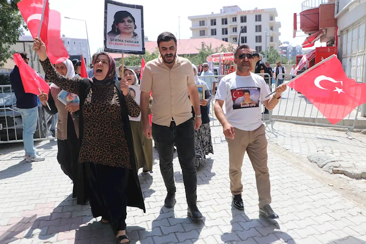 DEM Parti İl Başkanlığı binası önündeki evlat nöbeti 86'ncı haftada sürüyor. İpekyolu ilçesindeki Menekşe Sokak'ta bir araya gelen aileler, ellerinde Türk bayrakları ve çocuklarının fotoğrafları ile DEM Parti il binasına kadar yürüdü. Polisin yoğun güvenlik önlemi aldığı yürüyüşte aileler, sloganlar attı. DEM Parti il binası önünde açılan müzik sesine, aileler slogan atarak tepkilerini dile getirdi.