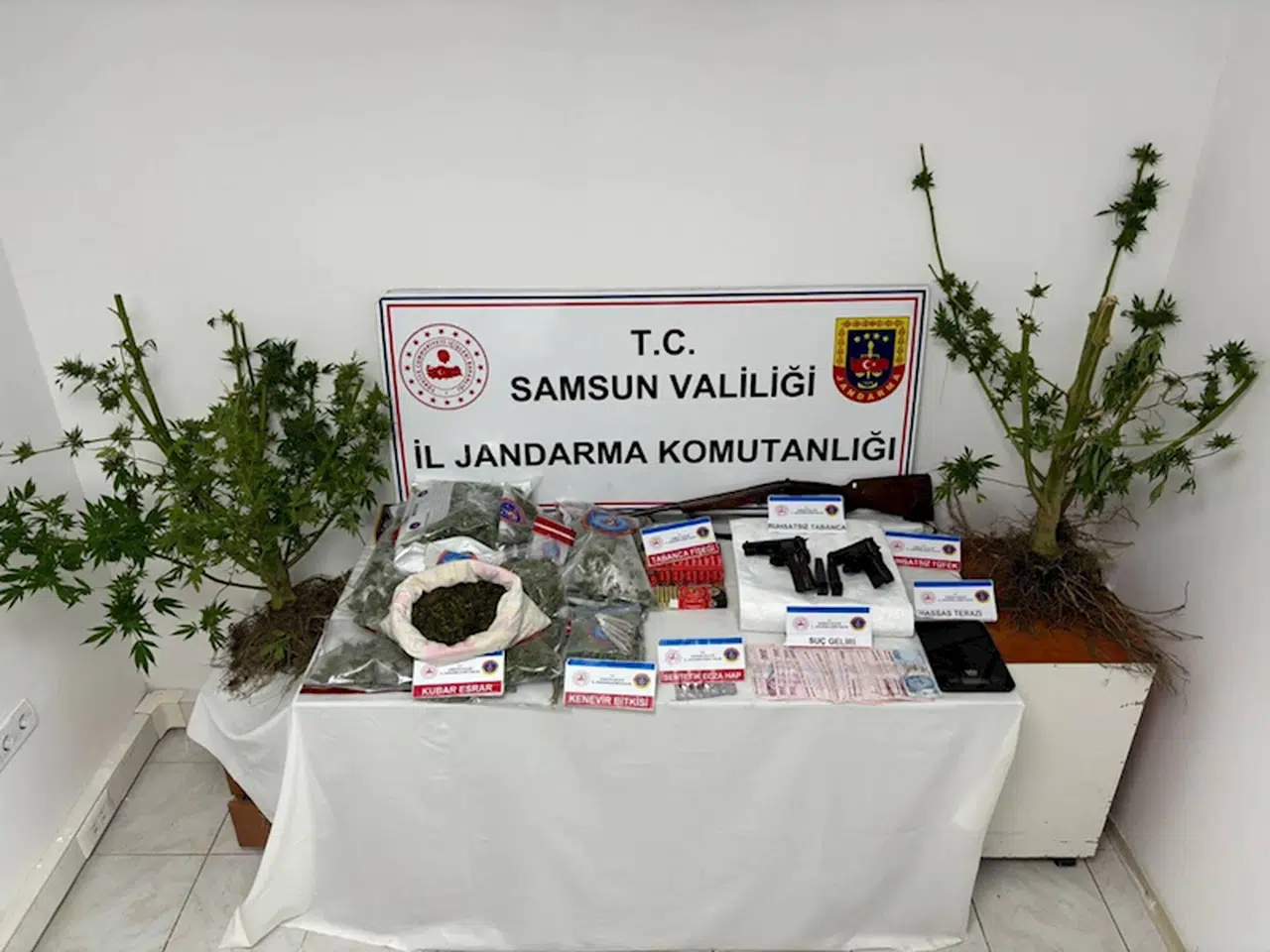Ekipler, belirlenen adrese düzenledikleri operasyonda narkotik dedektör köpeği "Tahra" desteğinde arama yaptı. Aramalarda, evlerde saklanan 8 kilo 571 gram kubar esrar, ⁠4 sentetik ecza hapı, ⁠6 kök kenevir bitkisi, hassas terazi, ⁠ruhsatsız tabanca ve ⁠350 fişek ele geçirildi.