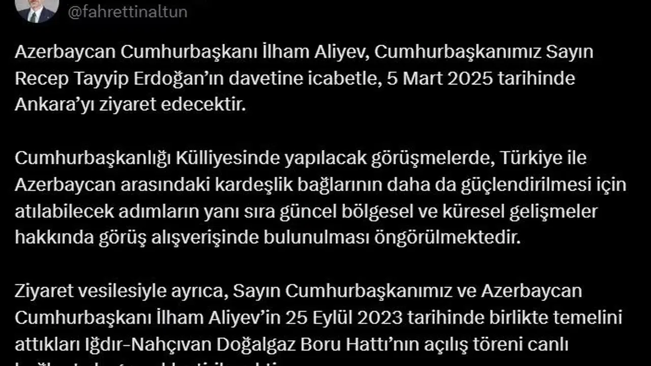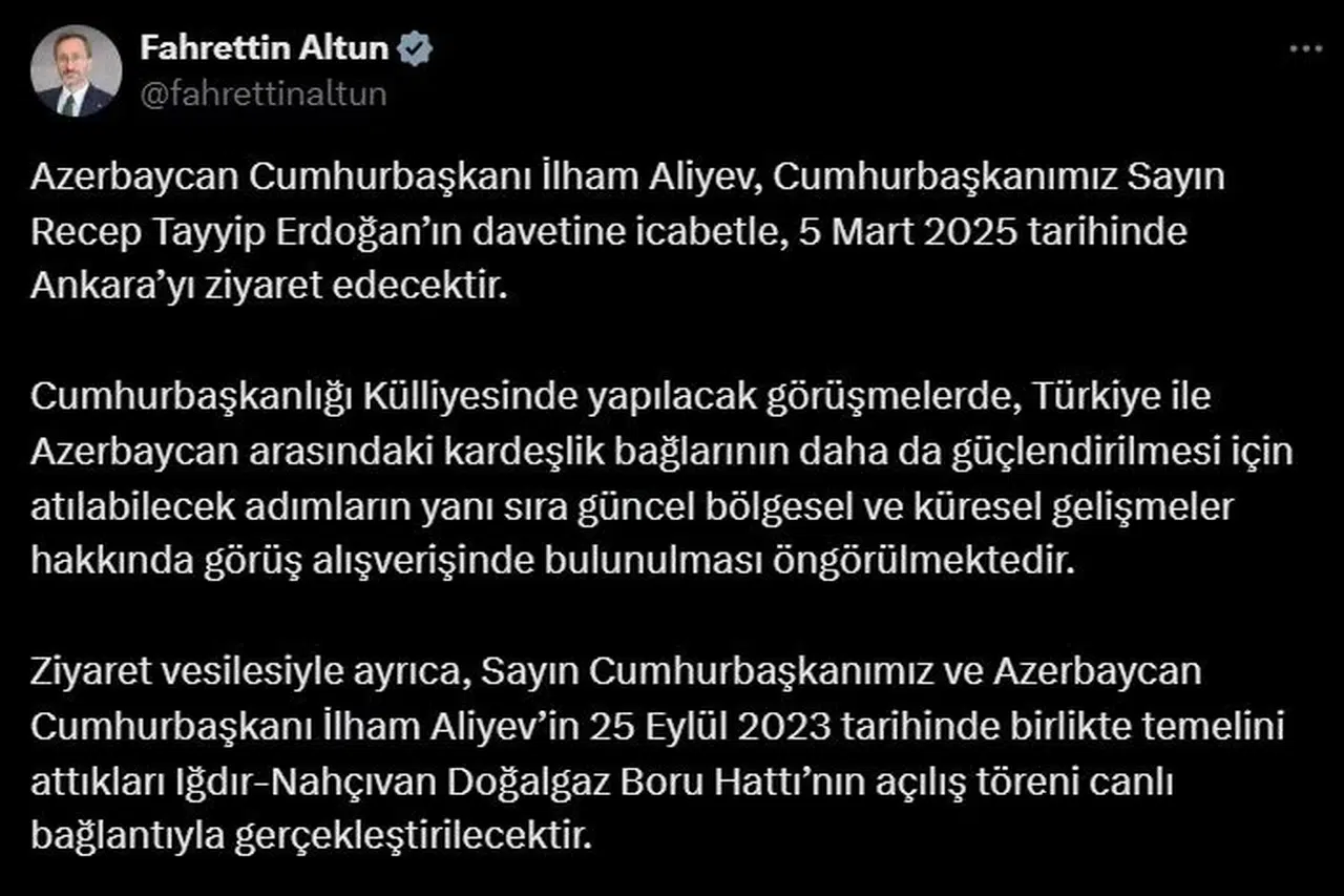 İletişim Başkanı Altun, sosyal medya hesabından yaptığı açıklamada, "Azerbaycan Cumhurbaşkanı İlham Aliyev, Cumhurbaşkanımız Sayın Recep Tayyip Erdoğan’ın davetine icabetle, 5 Mart 2025 tarihinde Ankara’yı ziyaret edecektir. Cumhurbaşkanlığı Külliyesi’nde yapılacak görüşmelerde, Türkiye ile Azerbaycan arasındaki kardeşlik bağlarının daha da güçlendirilmesi için atılabilecek adımların yanı sıra güncel bölgesel ve küresel gelişmeler hakkında görüş alışverişinde bulunulması öngörülmektedir. Ziyaret vesilesiyle ayrıca, Sayın Cumhurbaşkanımız ve Azerbaycan Cumhurbaşkanı İlham Aliyev’in 25 Eylül 2023 tarihinde birlikte temelini attıkları Iğdır-Nahçıvan Doğalgaz Boru Hattı’nın açılış töreni canlı bağlantıyla gerçekleştirilecektir” dedi. (DHA)