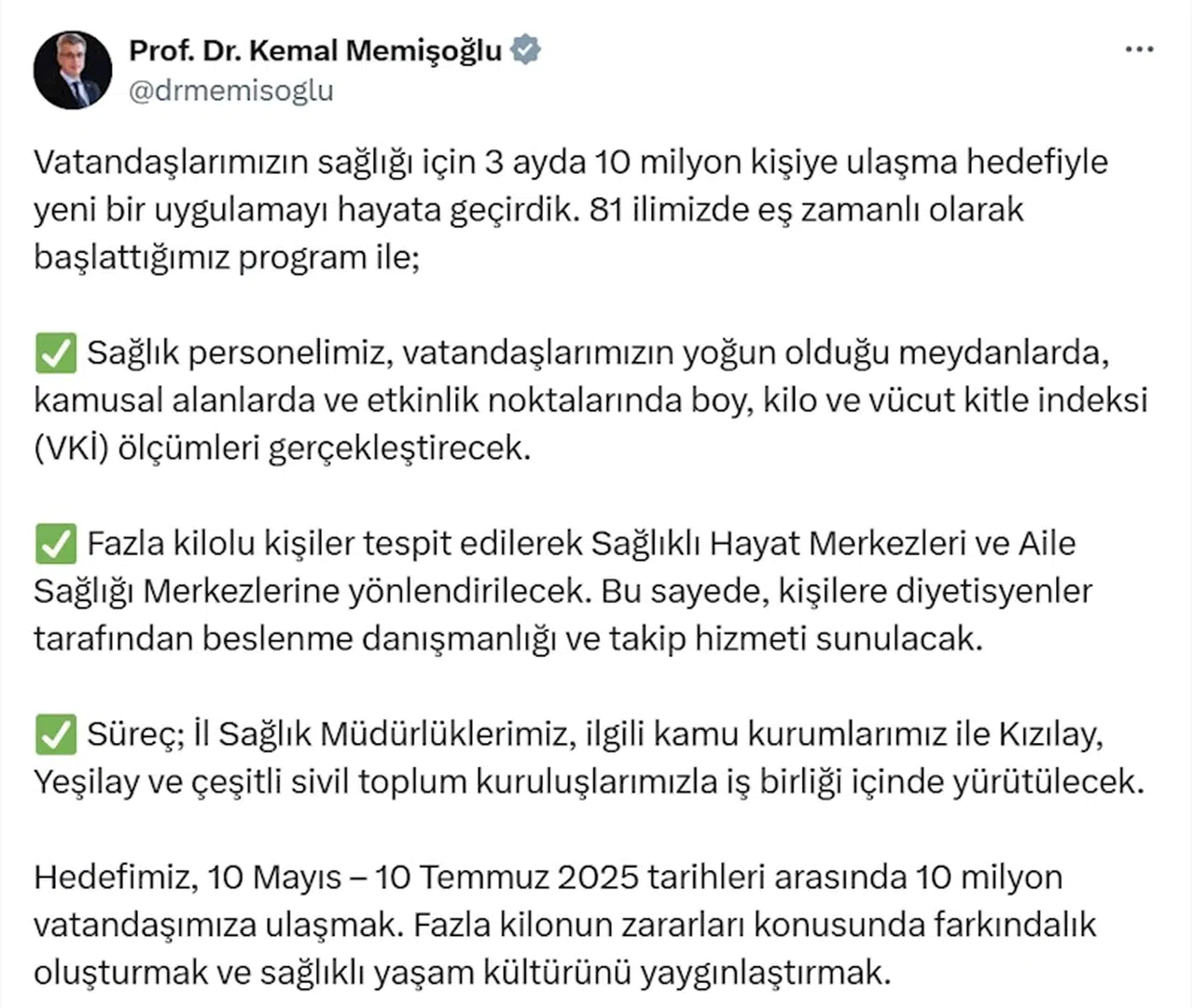 Bakan Memişoğlu, sosyal medya hesabından yaptığı açıklamada, "Vatandaşlarımızın sağlığı için 3 ayda 10 milyon kişiye ulaşma hedefiyle yeni bir uygulamayı hayata geçirdik. 81 ilimizde eş zamanlı olarak başlattığımız program ile sağlık personelimiz, vatandaşlarımızın yoğun olduğu meydanlarda, kamusal alanlarda ve etkinlik noktalarında boy, kilo ve vücut kitle indeksi (VKİ) ölçümleri gerçekleştirecek. Fazla kilolu kişiler tespit edilerek Sağlıklı Hayat Merkezleri ve Aile Sağlığı Merkezlerine yönlendirilecek. Bu sayede, kişilere diyetisyenler tarafından beslenme danışmanlığı ve takip hizmeti sunulacak" diye konuştu.