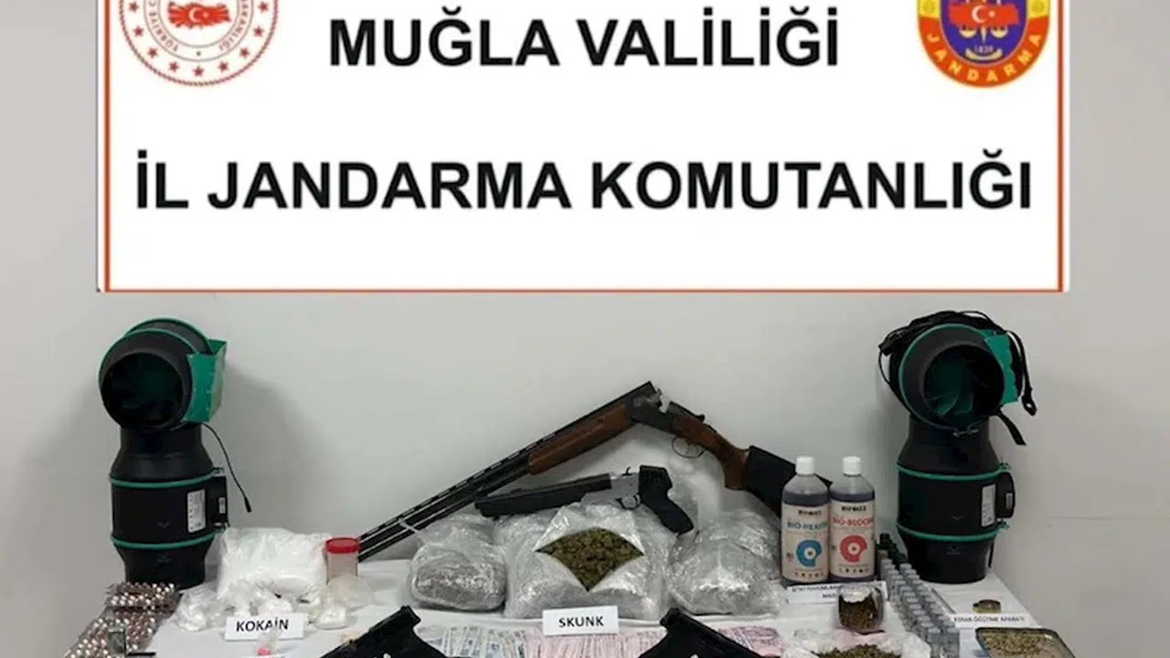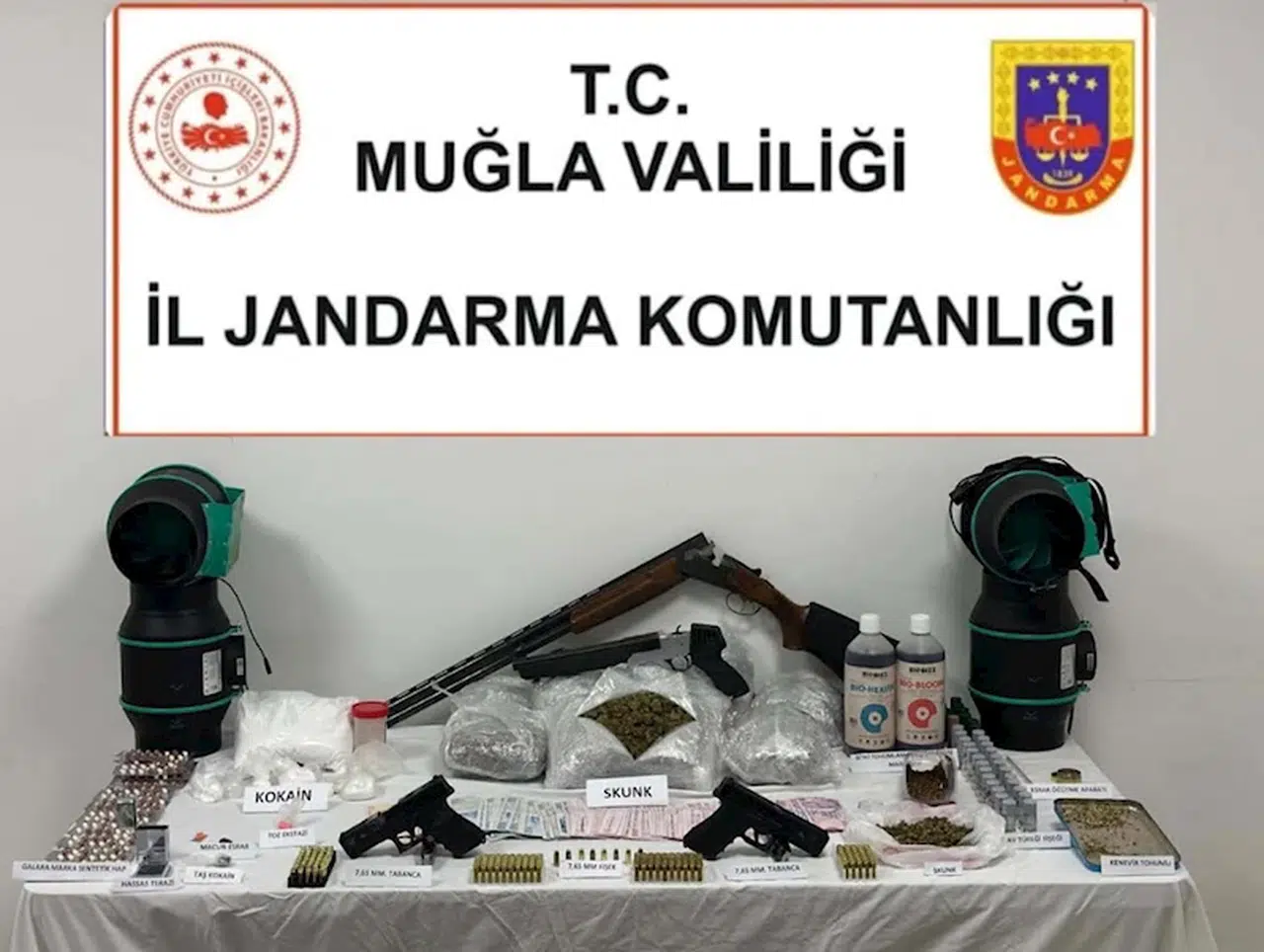 Muğla İl Jandarma Komutanlığı ekipleri, ilçede 'ruhsatsız silah bulundurma' suçundan üç ayrı arama kaydı bulunan E.A.Y. ile uyuşturucu imalatı ve ticareti yaptığı şüphesi ile R.A'yı takibe aldı. Ortak hareket ettiği tespit edilen 2 şüphelinin Pazaryeri ve Kayaköy Mahalleleri'ndeki adreslerine 24 Aralık günü operasyon düzenlendi. Operasyonda yapılan aramalarda 5 kilogram skunk, 2 kilogram kokain, 95 adet sentetik hap, 2 gram ekstazi, 3 gram taş kokain ve 5 gram macun esrar, 1 adet hassas terazi, 150 adet kilitli poşet ve çeşitli uyuşturucu ekipmanları, 2 ruhsatsız tabanca, 1 kısa namlulu pompalı tüfek, 1 ruhsatsız av tüfeği, çeşitli çaplarda toplam 193 fişek, uyuşturucu yetiştirmek için kullanılan gübre ve iklimlendirme cihazları, 18 bin 400 TL suçtan elde edildiği değerlendirilen nakit para ele geçirildi. Gözaltına alınan 2 şüpheli, Fethiye Cumhuriyet Başsavcılığı koordinesinde sevk edildikleri mahkemece tutuklandı. (DHA)