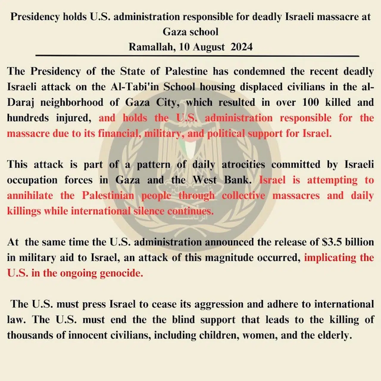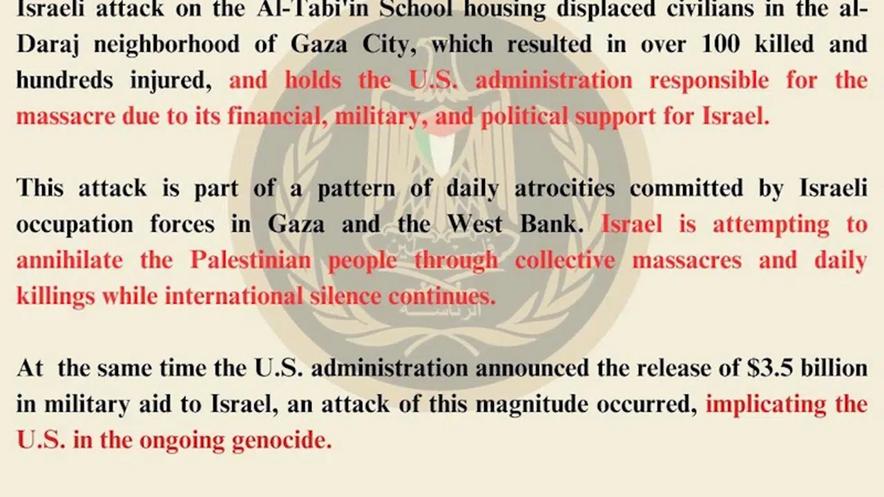 Filistin Devlet Başkanlığı Ofisi’nden yapılan açıklamada, “Başkanlık, Gazze okulundaki ölümcül İsrail katliamından ABD yönetimini sorumlu tutuyor. Filistin Devlet Başkanlığı, Gazze Şehri'nin el-Daraj semtinde yerinden edilmiş sivillerin yaşadığı El-Tabi'in Okulu'na düzenlenen ve 100'den fazla kişinin ölümüne ve yüzlercesinin yaralanmasına neden olan son ölümcül İsrail saldırısını kınadı ve ABD yönetimini, İsrail'e verdiği mali, askeri ve siyasi destek nedeniyle katliamdan sorumlu tutuyor.