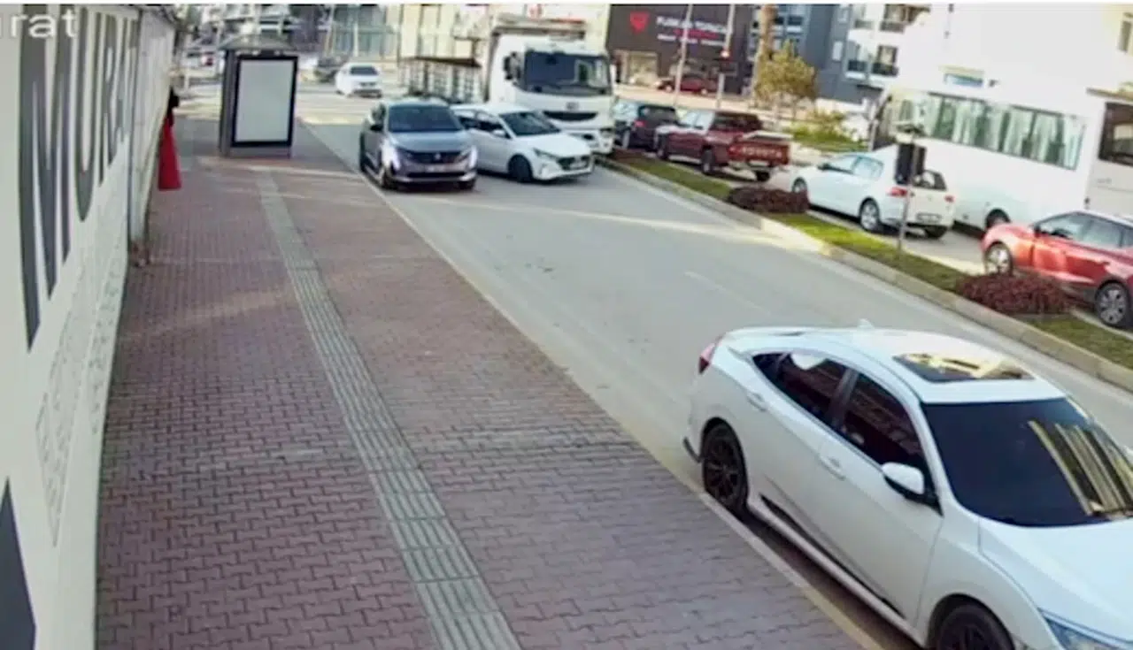 Kaza anı bölgedeki bir işletmenin güvenlik kamerasına yansıdı. Görüntüde otomobil ve kamyonun kavşaktan yan yana geçtikten sonra çarpışması, kontrolden çıkan otomobilin önce park halindeki araca ardından da kaldırımdaki motosiklete çarptığı anlar yer aldı. (DHA)