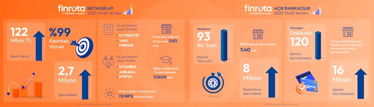 İSTANBUL,(DHA) - FİNTEK şirketlerinden Finrota, 2025 yılının ilk çeyreğine ilişkin performans verilerini açıkladı. Buna göre online tahsilat platformu Netahsilat aracılığıyla toplam 2,7 milyon işlemde 122 milyar TL tahsilat gerçekleştirildi. Kart hareketi raporlama çözümü Posrapor ise yılın ilk çeyreğinde 16 milyon hareketi işledi. Dakikada 120 kart hareketi işleme kapasitesiyle şirketin muhasebe ve finans ekiplerine binlerce saatlik zaman kazandırdığı belirtildi.