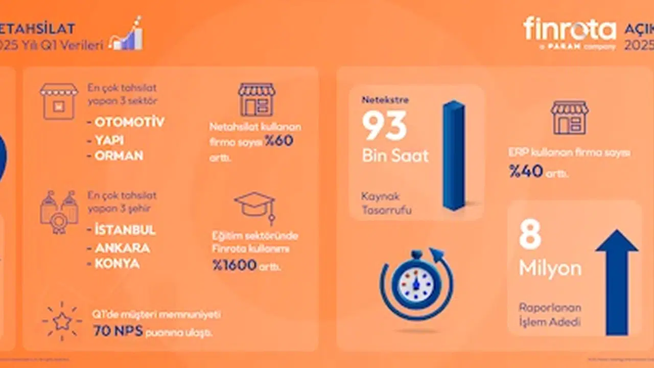 "İlk çeyrekte otomotiv, yapı ve orman ürünleri sektörlerinde dikkat çekici bir dijital tahsilat hacme aracılık etti. Bu sektörlerdeki işletmeler, Finrota'nın otomatik tahsilat sistemleri sayesinde zaman ve operasyonel maliyet avantajı elde etti. Yılın ilk çeyreğinde dikkat çeken bir diğer veri ise eğitim sektöründen geldi. Bu alandaki Netahsilat kullanımı, geçen yılın aynı dönemine göre tam yüzde 1600 oranında artış gösterdi.