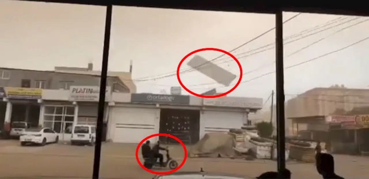 Salih KESKİN/KIZILTEPE (Mardin), (DHA)- MARDİN’in Kızıltepe ilçesinde etkili olan fırtınada bir iş yerinin çatısından uçan sac levha, elektrik tellerine çarpıp yön değiştirdi. Bu sırada yoldan geçen motosikletteki 2 kişi ölümden döndü.