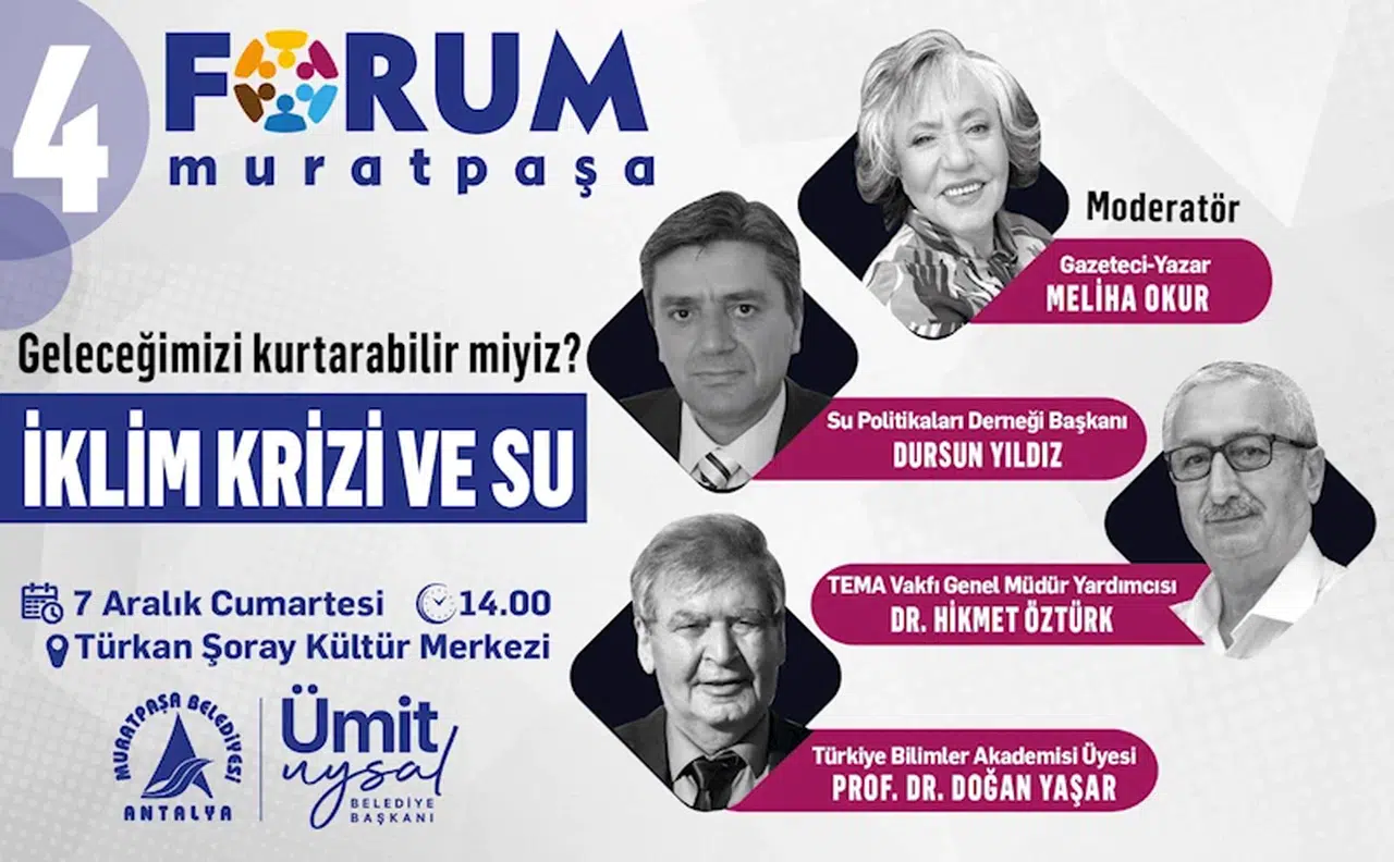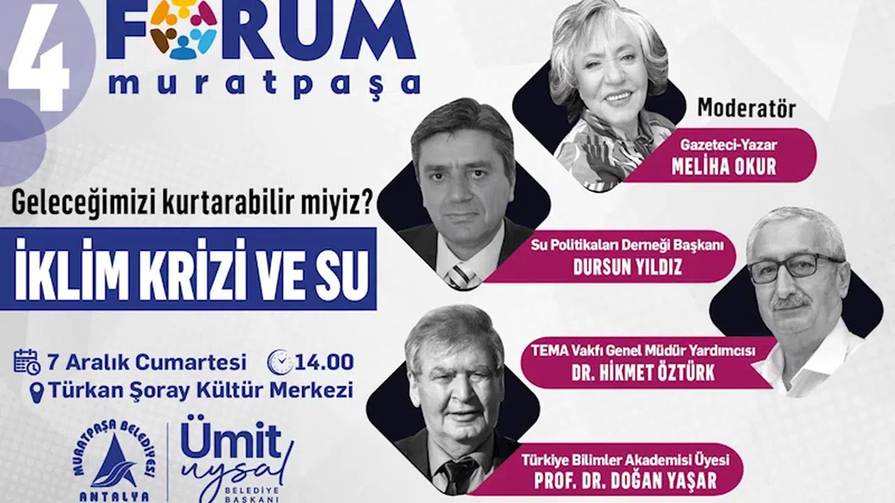ANTALYA, (DHA) - MURATPAŞA Belediyesi’nin her ay farklı bir konuyu ele aldığı Forum Muratpaşa’nın aralık ayı gündemi, tüm dünyayı yakından ilgilendiren 'İklim krizi ve su' olacak. Forum, 7 Aralık Cumartesi günü saat 14.00’te Türkan Şoray Kültür Merkezi’nde gerçekleşecek.