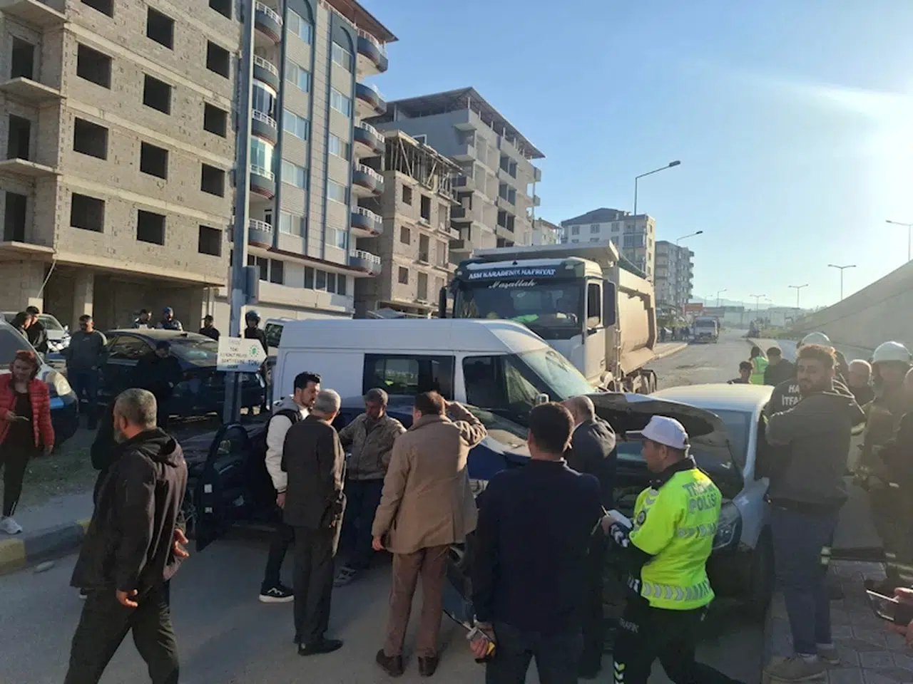 Ufuk AKTUĞ/İSKENDERUN, (Hatay), (DHA)- HATAY'ın İskenderun ilçesinde, fren sistemindeki arıza nedeniyle duramayan hafriyat kamyonu, kavşakta bekleyen 5 araca çarptı. 3 kişinin hafif yaralandığı kaza, güvenlik kamerasına yansıdı.