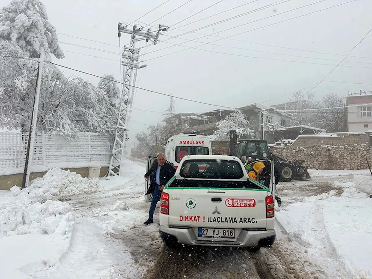 Gaziantep'te dün akşam saatlerinde başlayıp, bugün de devam eden kar yağışı nedeniyle kırsal mahalle yolları ulaşıma kapandı. Yolları açmak için çalışmalar başlatılırken; sabah saatlerinde 112 Acil Çağrı Merkezi'ne, Araban'a bağlı Yaylacık ve Beydilli mahallelerinden 3 hasta ihbarı yapıldı. İhbarın ardından yola çıkan ambulanslar, kar nedeniyle kapanan yollarda ilerleyemeyince belediyeden yardım istedi. Çağrı üzerine harekete geçen belediye ekipleri, sağlık görevlilerini araçlarına alarak, Yaylacık ve Beydilli mahallelerinde iş makineleri ile karlı yolları açtı. Karların temizlenerek ulaşılmasının ardından sağlık görevlileri, Yaylacık Mahallesi'nde yedikleri yemekten zehirlenen Ayşe Şimşek (70) ile oğlu Seydi Şimşek (30) ve Beydilli Mahallesi'nde yüksek tansiyon şikayeti bulunan Eramus Özdemir'i (30) ilk müdahalesini yaparak, iş makineleri ile ambulansların olduğu bölgeye ulaştırdı. Hastalar daha sonra iş makinelerinin önünde hareket ettiği ambulanslar ile Araban Devlet Hastanesi'ne ulaştırıldı.