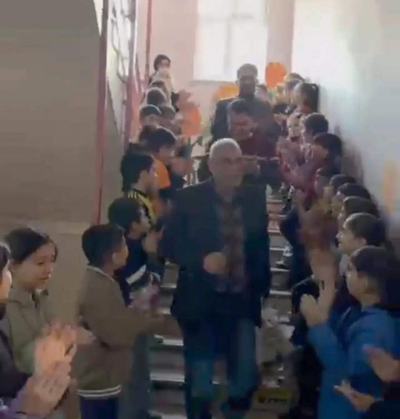 İslahiye Pınarbaşı İlkokulu’nda 35 yıldır görev yapan ve emekli olan hizmetli Celal Kömür'ü okuldan ayrılırken öğrenciler yalnız bırakmadı. Okulun koridorunda ve merdivenlerinde iki sıra oluşturan öğrenciler, Celal Kömür'e çıkışı sırasında alkışlar eşliğinde veda etti.
