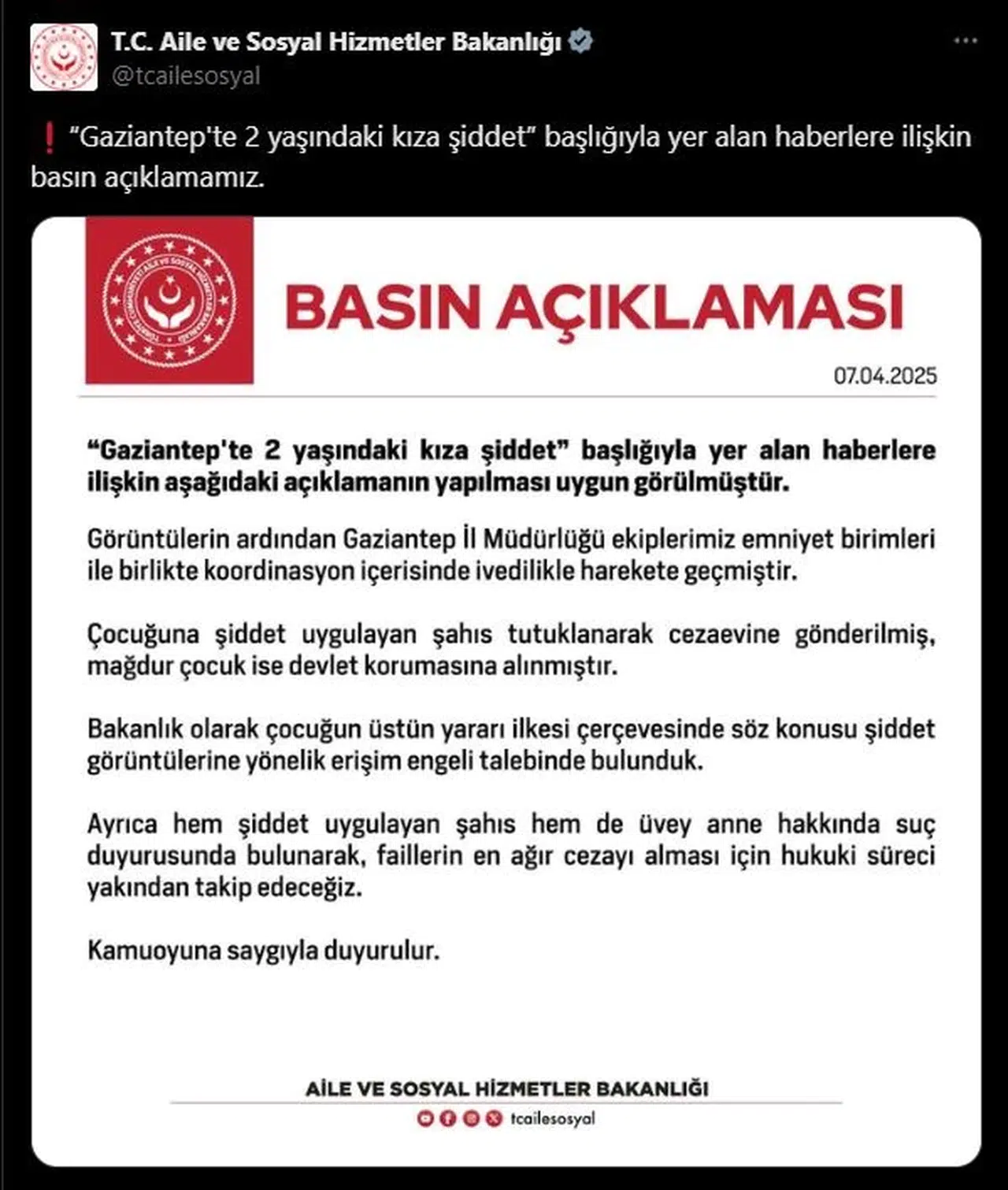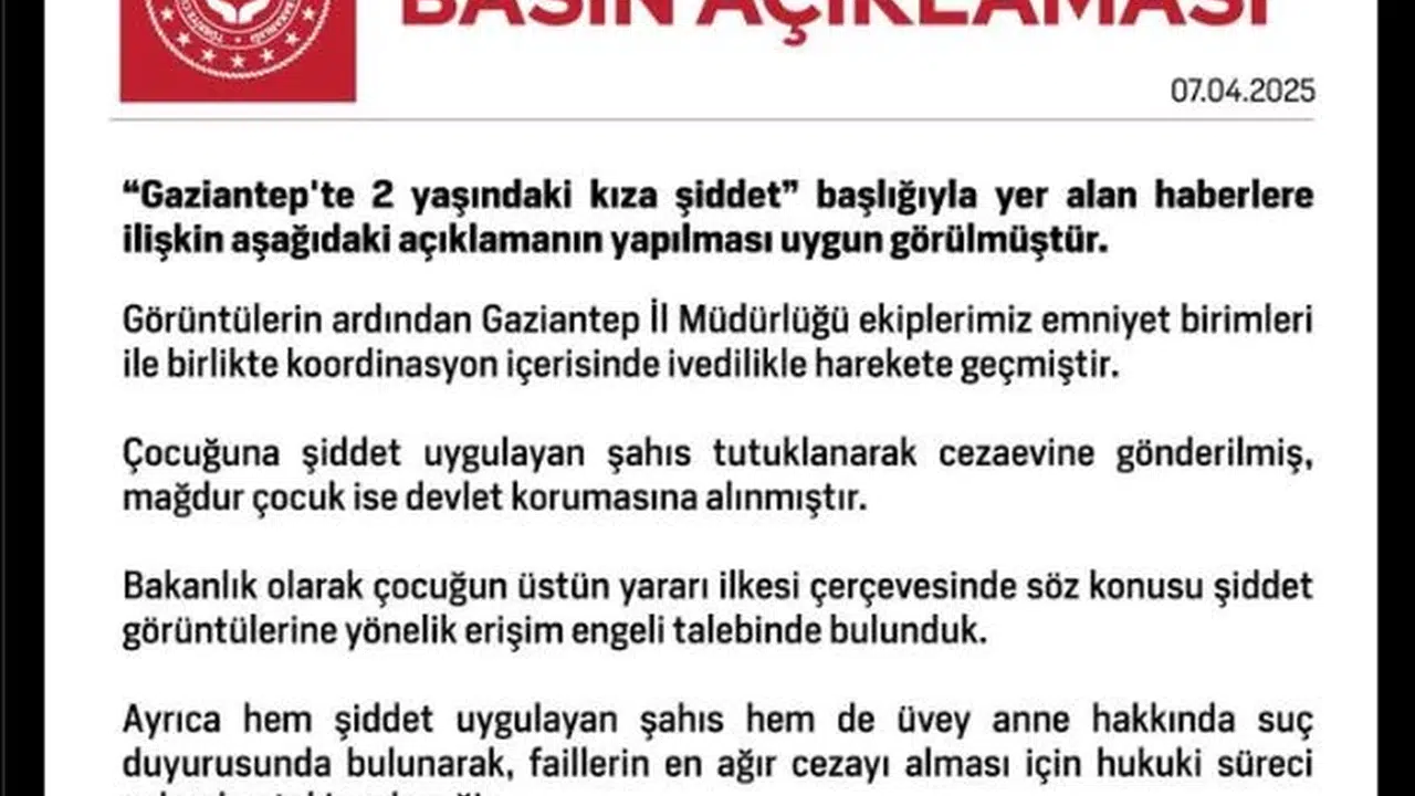 Bakanlıktan yapılan yazılı açıklamada, "'Gaziantep'te 2 yaşındaki kıza şiddet' başlığıyla yer alan haberlere ilişkin aşağıdaki açıklamanın yapılması uygun görülmüştür. Görüntülerin ardından Gaziantep İl Müdürlüğü ekiplerimiz emniyet birimleri ile birlikte koordinasyon içerisinde ivedilikle harekete geçmiştir. Çocuğuna şiddet uygulayan şahıs tutuklanarak cezaevine gönderilmiş, mağdur çocuk ise devlet korumasına alınmıştır. Bakanlık olarak çocuğun üstün yararı ilkesi çerçevesinde söz konusu şiddet görüntülerine yönelik erişim engeli talebinde bulunduk. Ayrıca hem şiddet uygulayan şahıs hem de üvey anne hakkında suç duyurusunda bulunarak, faillerin en ağır cezayı alması için hukuki süreci yakından takip edeceğiz. Kamuoyuna saygıyla duyurulur" ifadelerine yer verildi. (DHA)