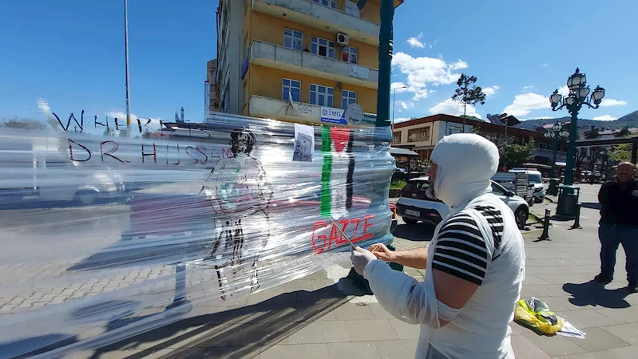 Nurbay USTA/ARHAVİ,(Artvin), (DHA)- ARTVİN'in Arhavi ilçesinde, akademisyen Doç. Dr. Kemal Sağlam, sargı bezleriyle sarılı kostüm giyerek yaralı bir Filistinliyi canlandırıp, Gazze'de yaşananları streç filmden oluşturduğu tuvale resmetti.