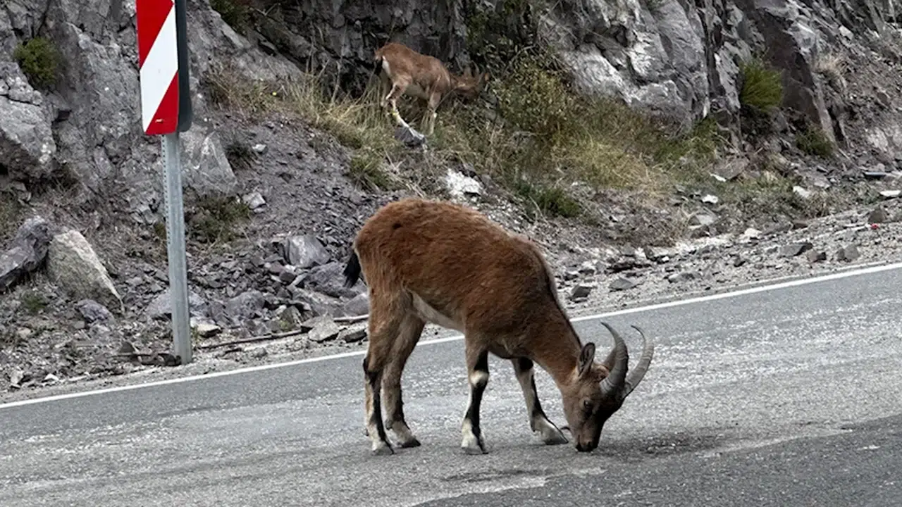 Yaban keçileri kara yolunda bir süre bekledikten sonra dağlık alana yönelerek gözden kayboldu.