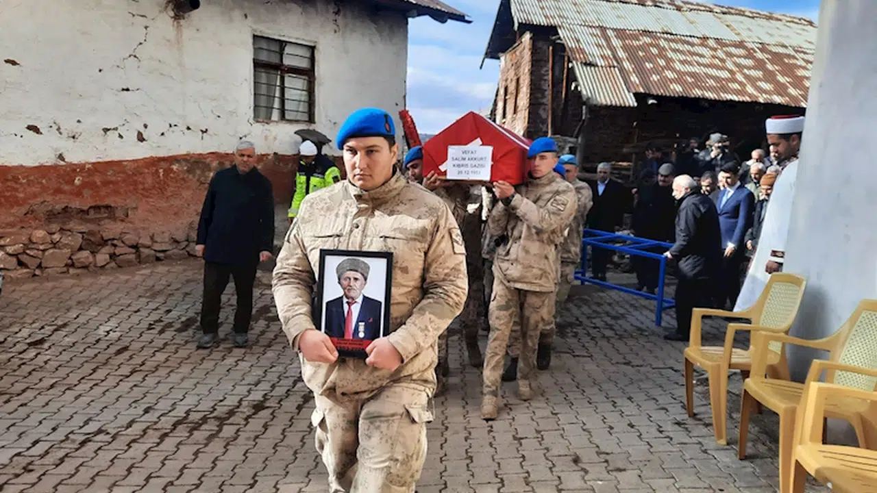Kıbrıs gazisinin Türk bayrağına sarılı cenazesi, askerlerin omzunda Çağlayan Köyü Camisine getirildi.