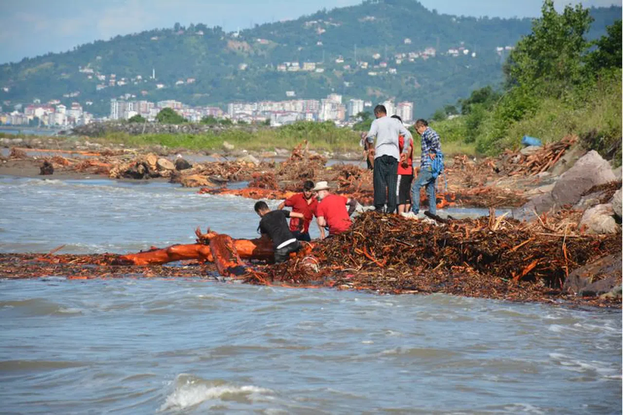 GİRESUN (AA) - Giresun'da şiddetli yağışla derelerden denize sürüklenen ağaç parçaları ve kütükler, vatandaşlar tarafından toplanıyor.