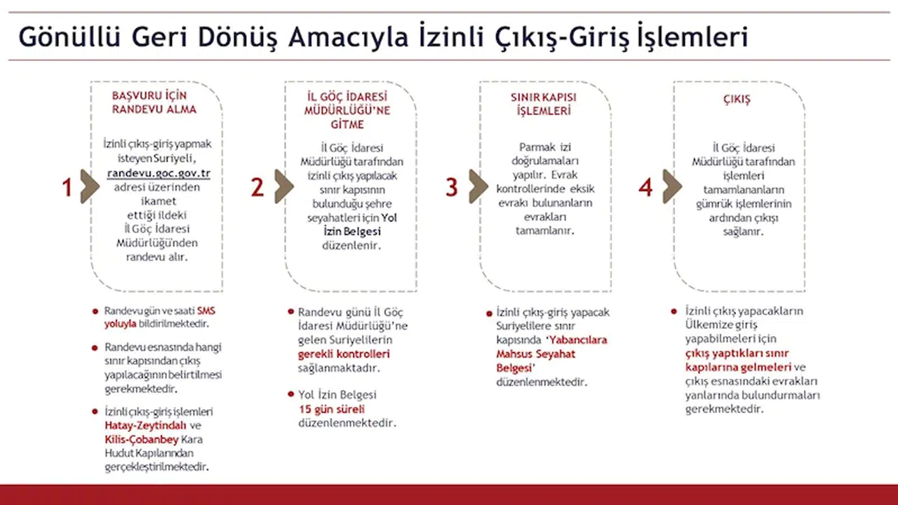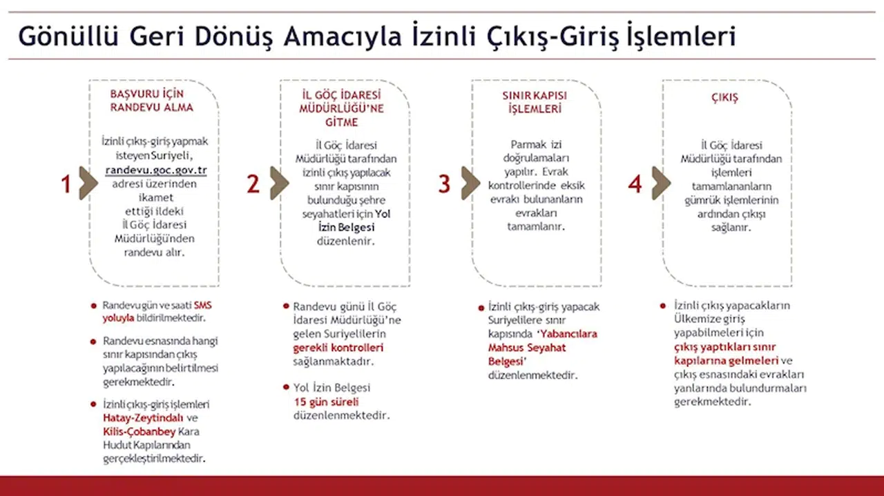 "Göç Randevu Sistemi üzerinden (randevu.goc.gov.tr) 'İzinli Çıkış-Giriş' amaçlı randevu alınması. Kısa mesaj (SMS) olarak iletilecek randevu bilgilerinde yer alan tarih ve saatte İl Göç İdaresi Müdürlüğüne gidilerek gerekli kontrollerin yaptırılması. (Parmak izi doğrulama, UYAP kaydı sorgulama vb.) Kişinin çıkış yapmak istediği sınır kapısının bulunduğu şehre seyahat edebilmesi amacıyla 15 gün süreli Yol İzin Belgesi'nin düzenlenmesi. Sınır kapısında yabancının parmak izi doğrulamasının yapılması ve çıkışına engel bir durumu olup olmadığına ilişkin son kontrollerin sağlanması. 'Yabancılara Mahsus Seyahat Belgesi' düzenlenen Suriyelilerin, gümrük işlemlerinin ardından izinli çıkışının sağlanması." (DHA)