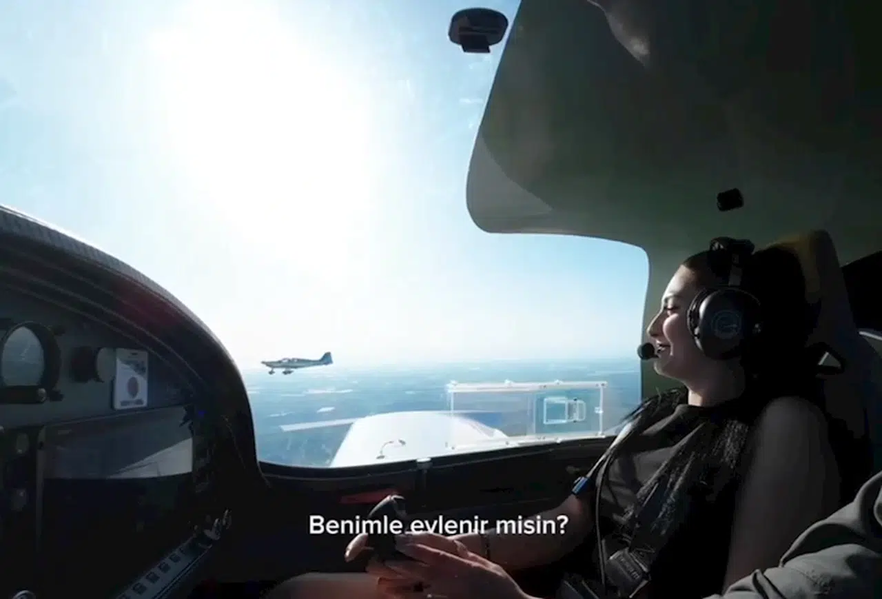 Kentte oto kiralama işiyle uğraşan Metin Topal, beden eğitimi öğretmeni sevgilisi Sebihe Nur Özerten'e sürpriz evlilik teklifi planı yaptı. Kentteki bir uçuş okuluyla anlaşan Topal, iki farklı uçak kiralayarak gökyüzünde gezinti yaptı. Metin Topal, havada sevgilisinin bulunduğu uçakla kol uçuşu yaparken telsizden anons geçerek "Aşkım yeryüzünde tanıştık. Böyle bir ilki yaşattığım için mutluyum. Umarım sen de mutlusundur. Geri kalan hayatımıza sonsuz bir aşk bulalım istiyorum. Benimle evlenir misin?" dedi. Şaşkınlık yaşayan Özerten, teklifi kabul ederek, "Diz çökmemek için yaptın bunu değil mi?" diyerek karşılık verdi. Gezinin ardından piste iniş yapan Metin Topal, Özerten'in önünde diz çökerek yeniden teklifte bulunup, yüzüğünü sundu. Genç çiftin, paylaştığı uçak kamerasına yansıyan görüntüler ilgi gördü. (DHA)