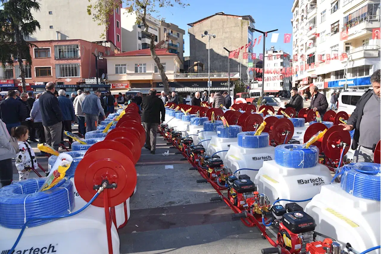 Görele Ziraat Odası Başkanlığınca başlatılan "yarısı bizden" kampanyası kapsamında tedarik edilen 48 ilaçlama makinesi, ilaç, kıyafet ve maske, Cumhuriyet Meydanı'nda düzenlenen törenle köy ve mahalle muhtarlarına teslim edildi.